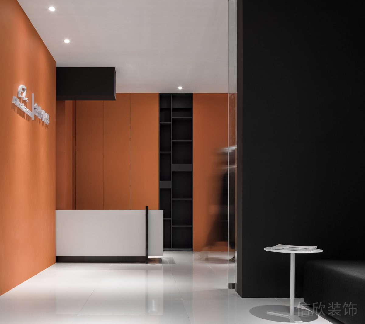 接待背景墻的設計通體做黑色處理,與大面積白色墻面形成強烈的對比。