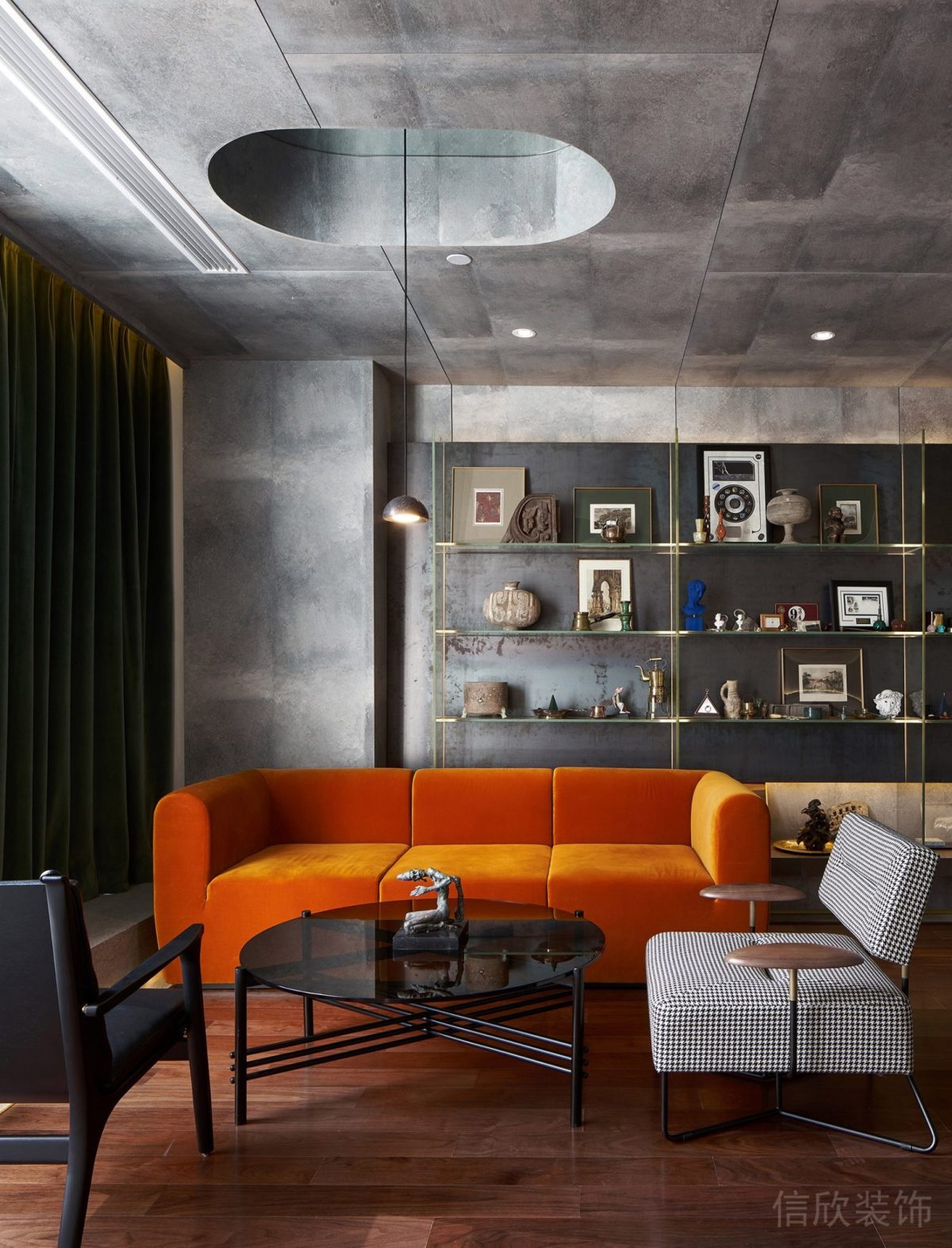 茶水休閑室中心區(qū)域擺置的天然老木大班臺成為了空間的視覺焦點(diǎn),呈現(xiàn)出典雅大氣的場域面貌。
