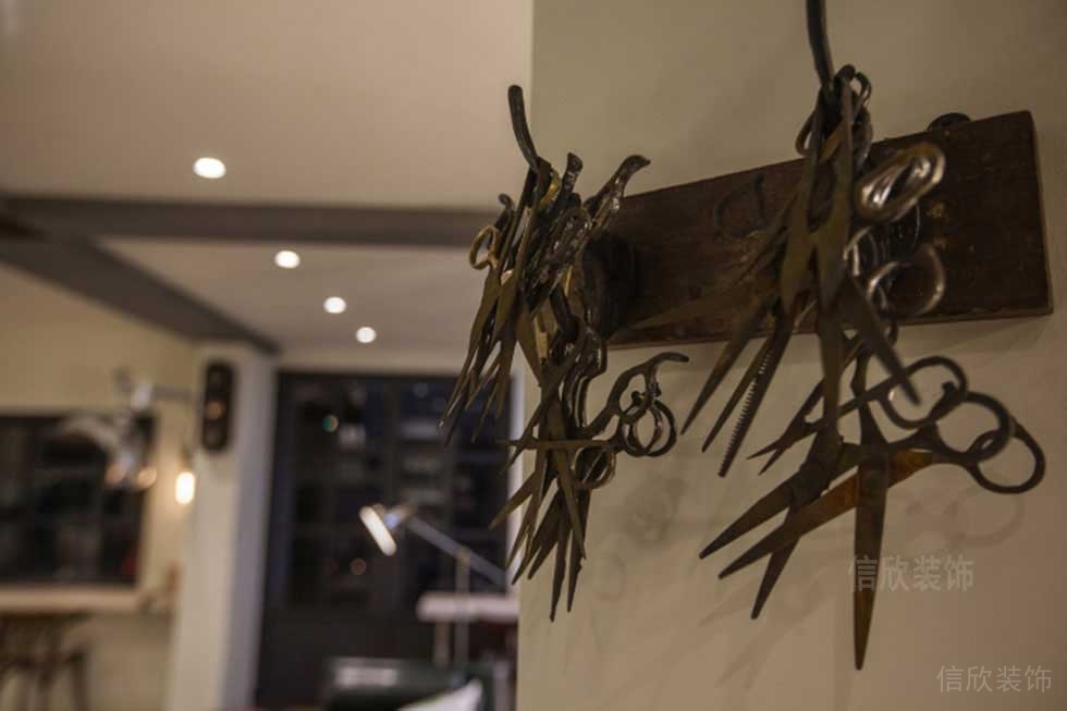 原木櫥柜取代傳統的隔墻,把洗頭區和造型區分開,區域的劃分上更加的合理,起到了隔而不斷的效果,增強了儲物和使用的功能性,同時加入一絲懷舊和復古的韻味。