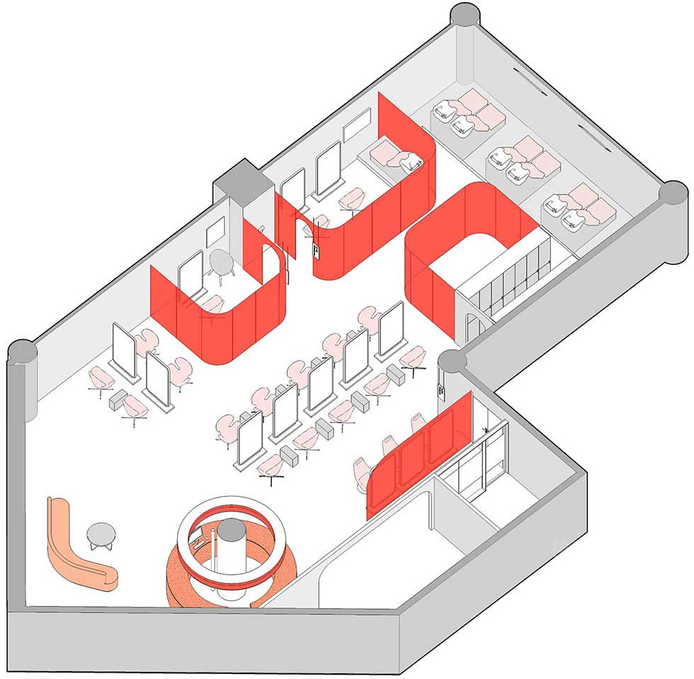 美發店外立面的裝修設計,采用水泥質感的頂面和開放式落地玻璃的設計,室內的景象在紅色玻璃的反射下,呈現出另一種沁人心脾的紅色經典,打開人們的好奇心想要進去一探究竟。