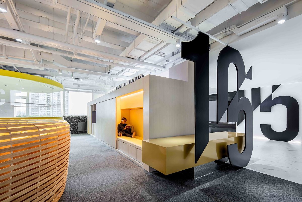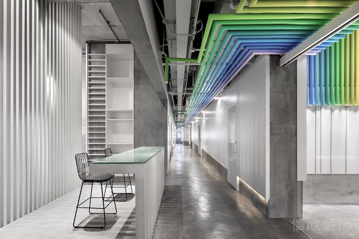 木質背景高端定制設計一體式辦公室過道休息區裝修設計效果圖