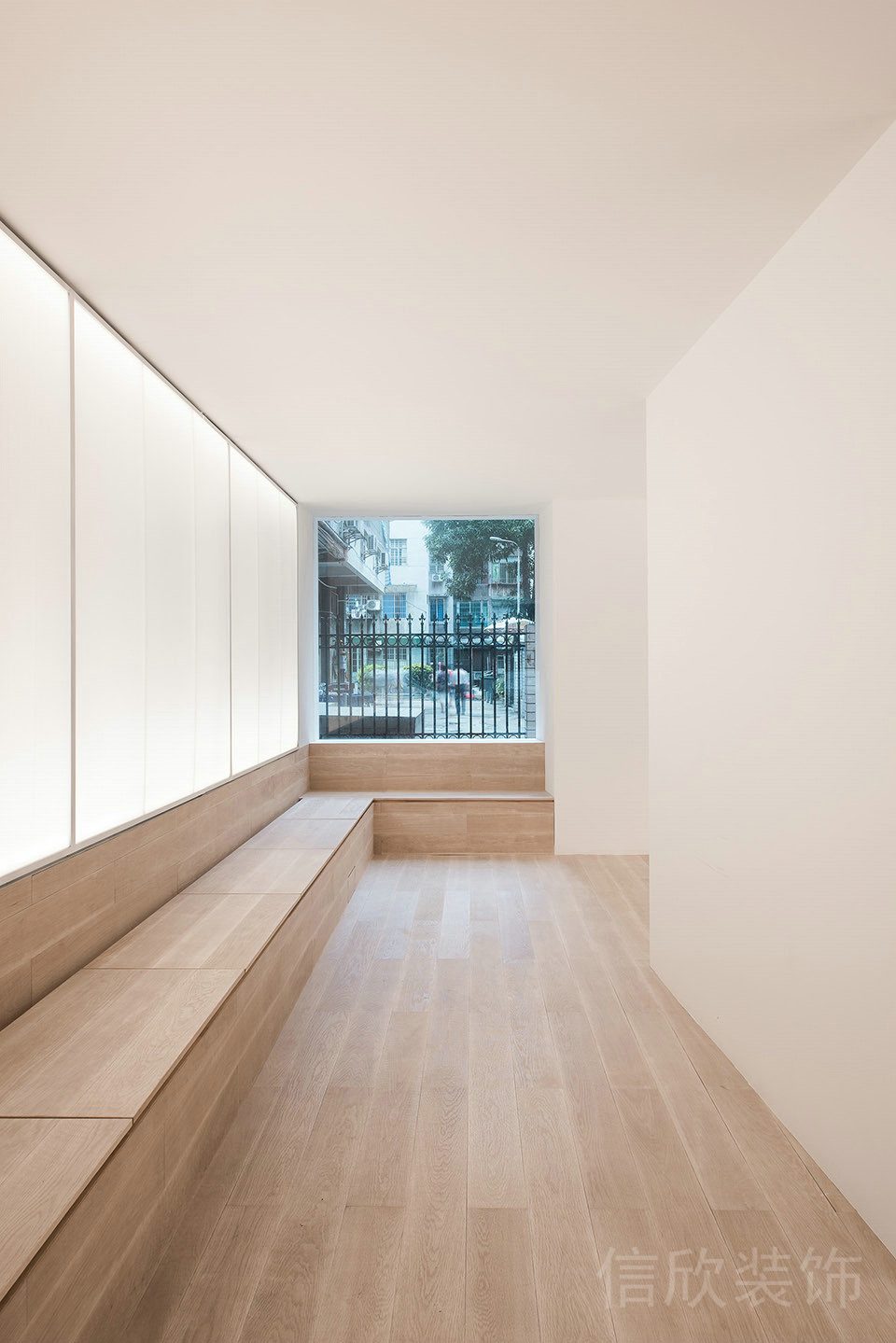 設計一個一體式的過道休息區,配合木質隔斷和玻璃半墻,確保視覺上的連貫性。