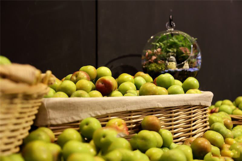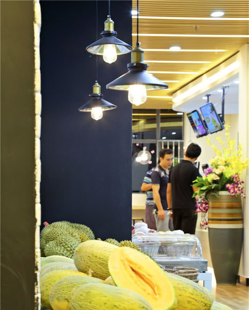 原結構的頂面噴黑處理,摒棄了復雜的設計方式,注重其經濟,環保,實用價值,白色文化石磚墻,各種新鮮水果的中島臺和保鮮柜,保證店里的水果一直新鮮和美味。