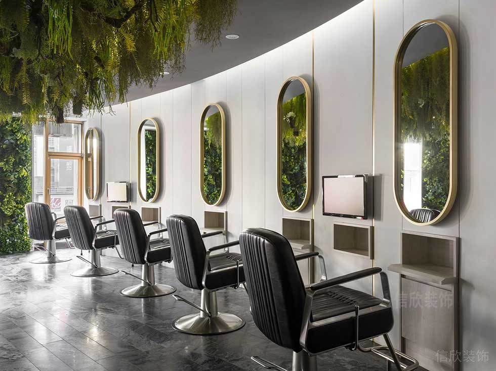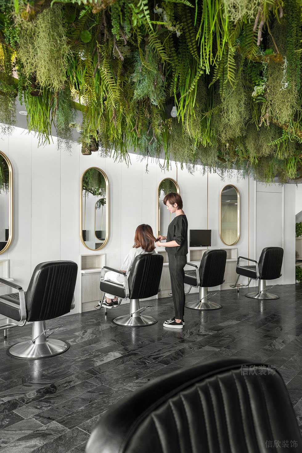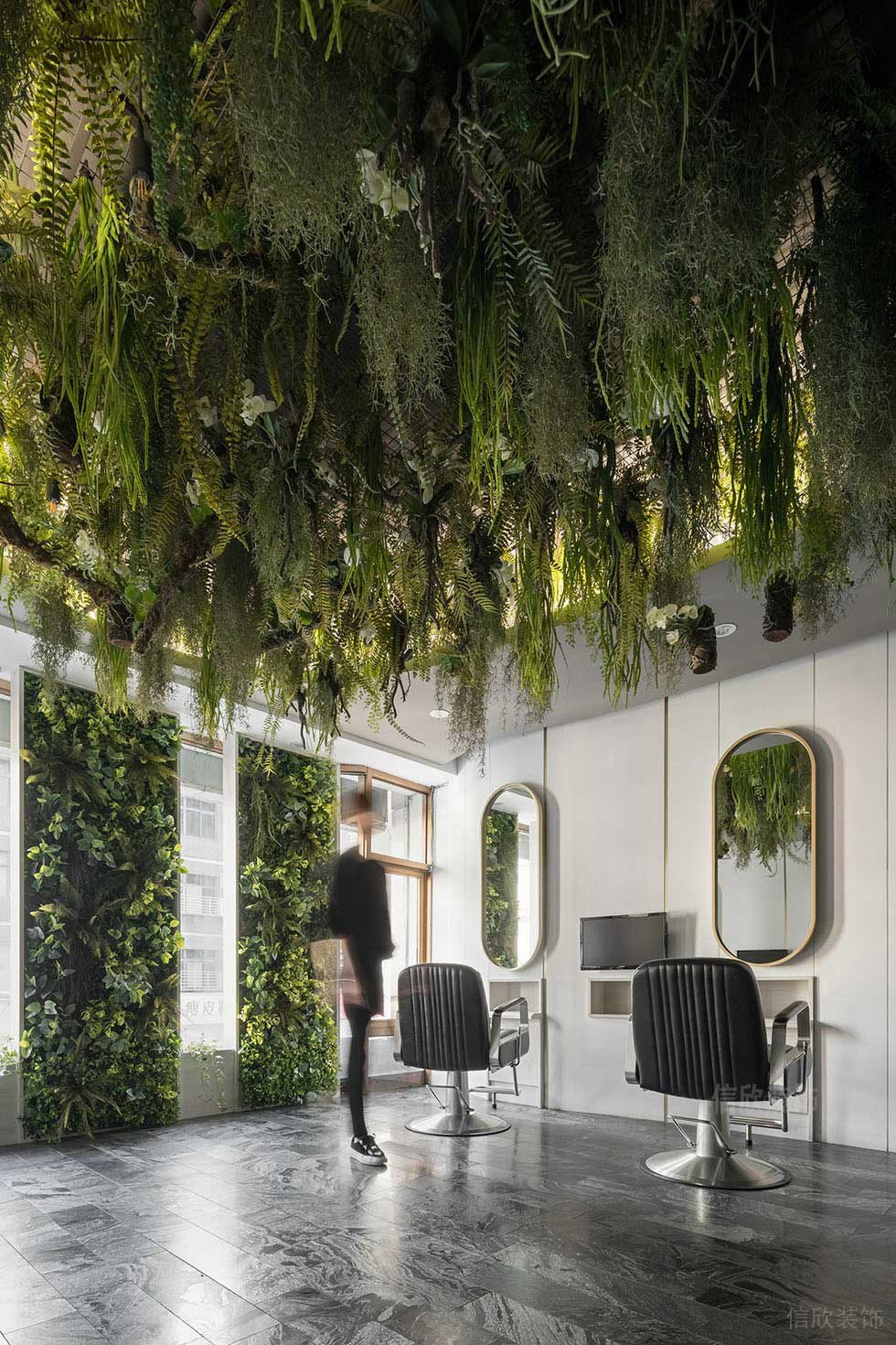 造型區的設計,采用直通式 的處理手法,頂部是下垂的綠植,給人的感覺比較自然和清新,而在一個個金屬邊框小鏡面的反射下,空間的立體感又能得到很好的提升效果。