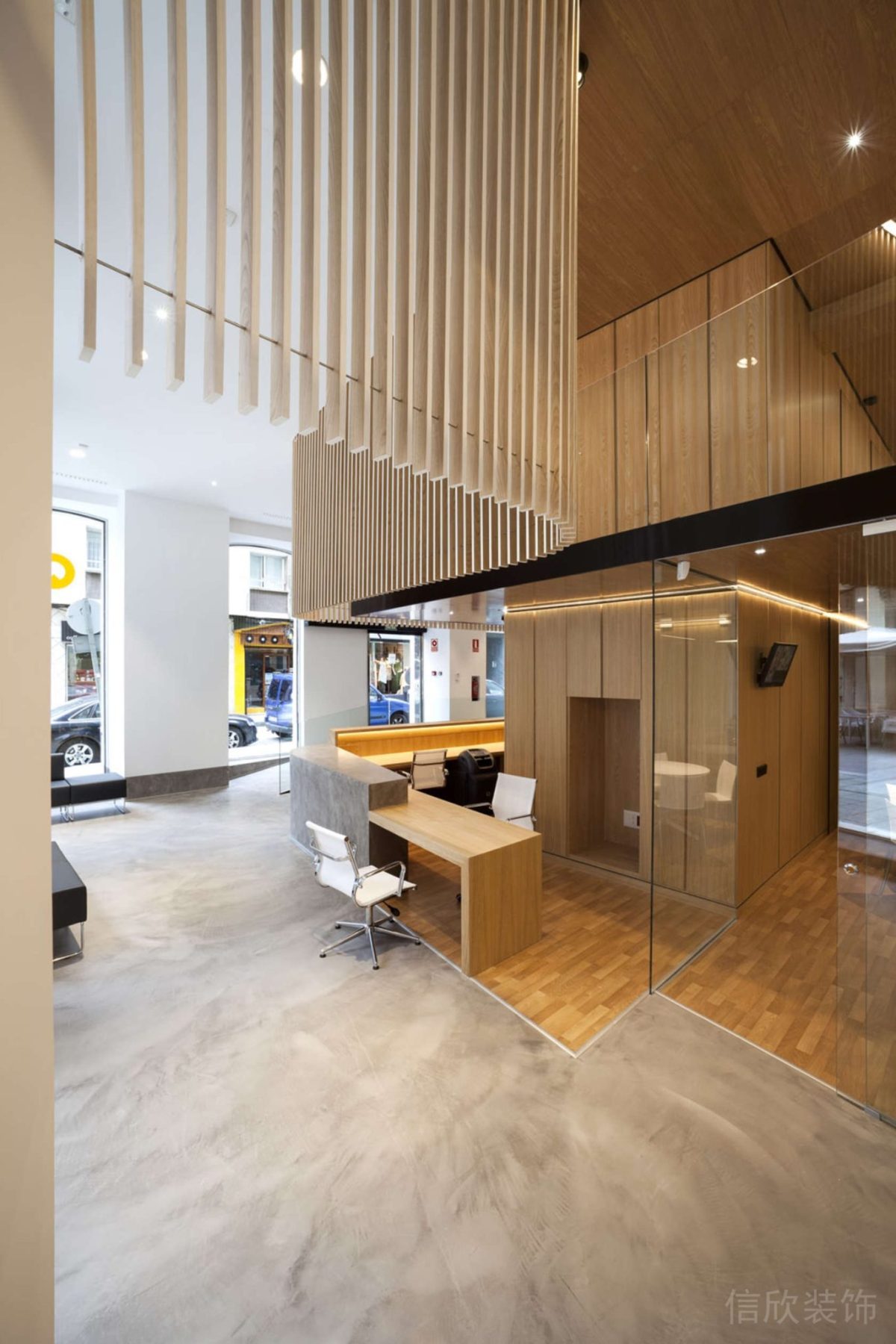 辦公區(qū)的裝修設(shè)計使空間富有層次感且具備了較高的融合度。