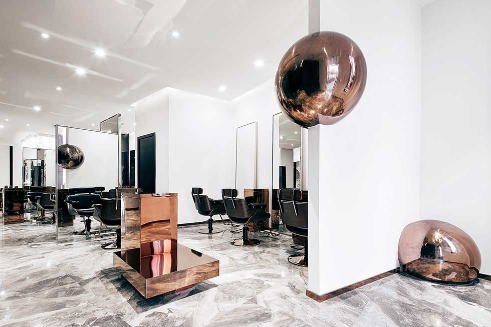 理發區是一個全開放的區域。整齊劃一的座位排布,形成規整的序列,搭建起理發師展現精湛手藝的舞臺。佇立在在舞臺中央的藝術雕像和懸掛在天花下的球體燈飾,則在打破這種均質關系,為整個空間注入靈動的藝術氣息。燈光照明上,設計師采用了盡量克制的方式,以理發區中央的管形藝術吊燈來提亮空間,使顧客能夠沉浸在柔和的氛圍之中。