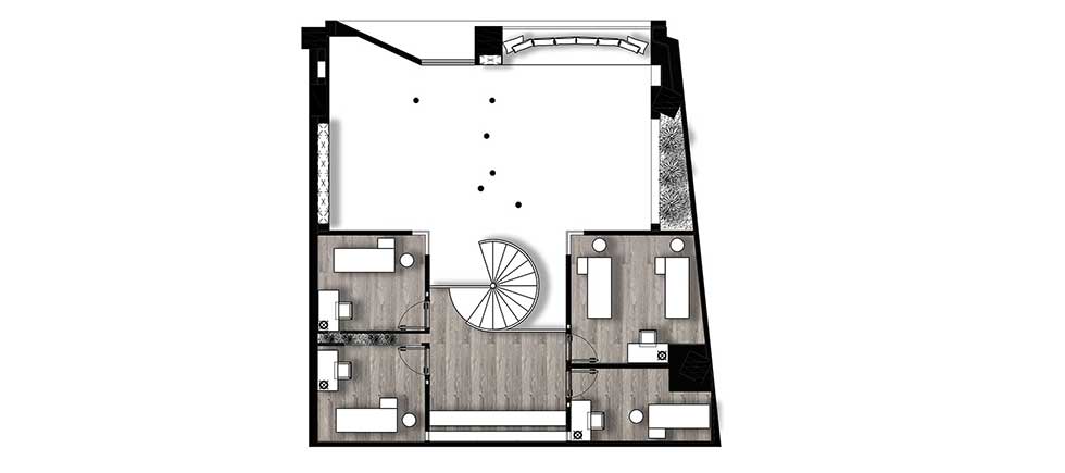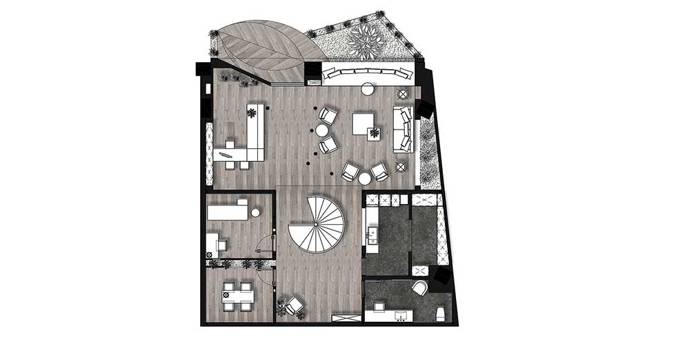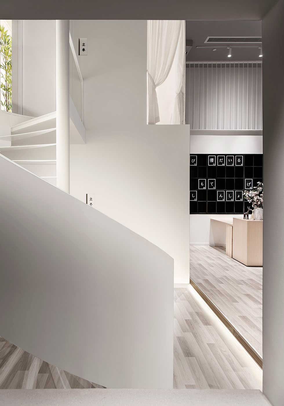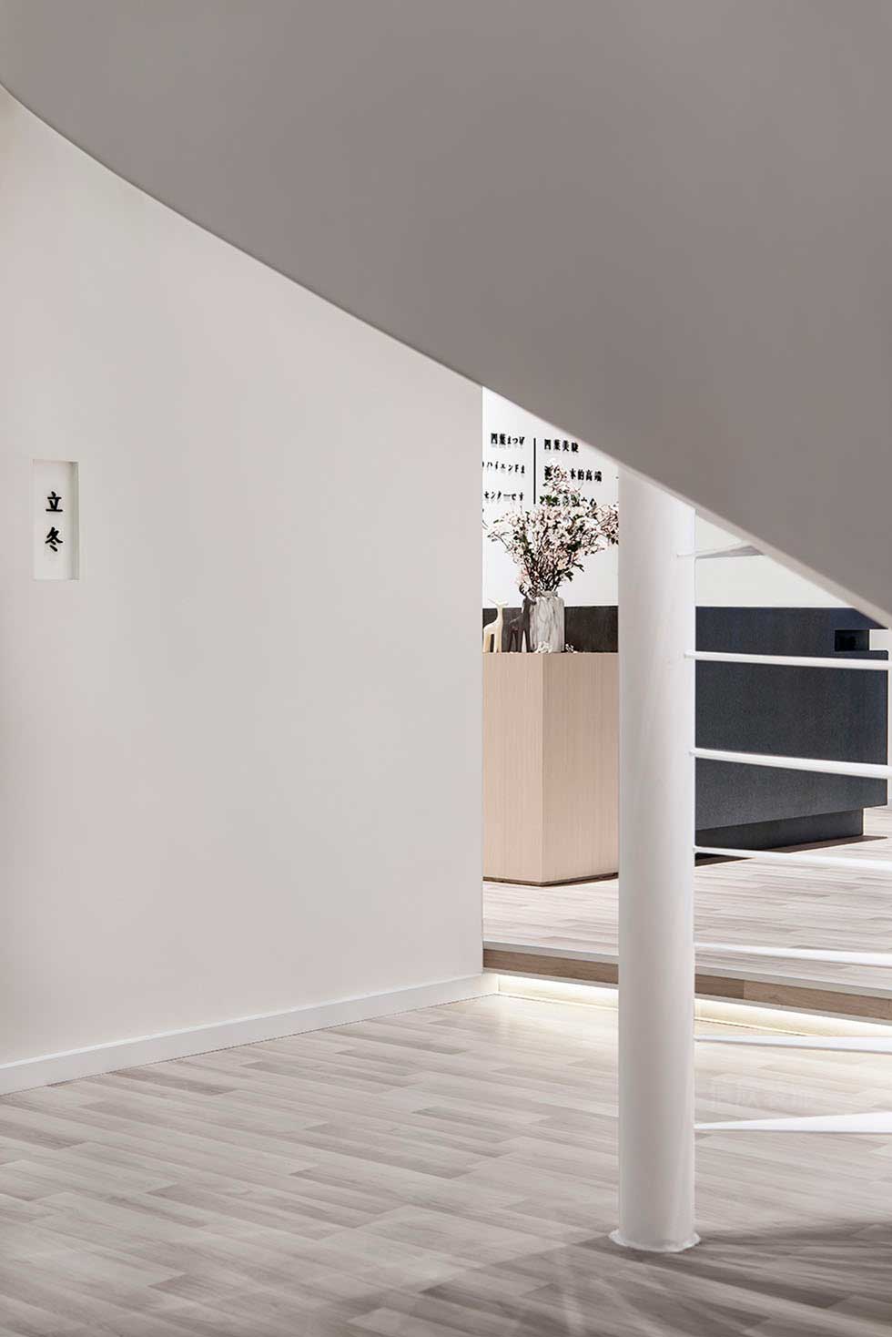 整個空間入口及休閑區做了一個抬高,將空間的公共區域和內部區域做了一個劃分。整個空間的中心點是連接一二層的飄帶狀旋轉樓梯。