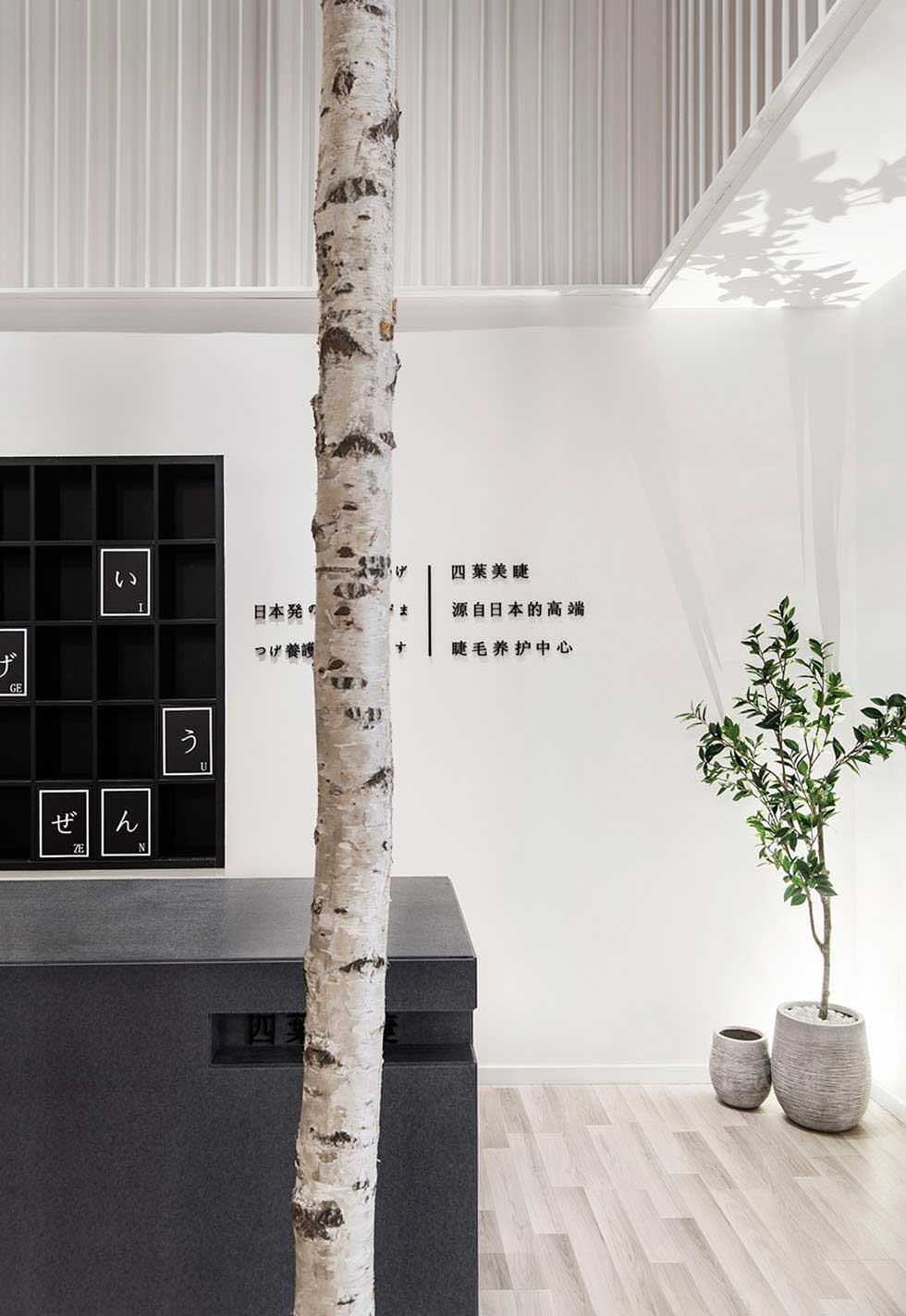 “有一株白樺,立在我窗旁,覆蓋著積雪,像披著銀霜。”??設計師將自然引入室內空間、大片白墻比作積雪,一片白樺林分割了前臺與休閑區。巧妙的設計使空間充滿純潔,朦朧,充滿寧靜的美。