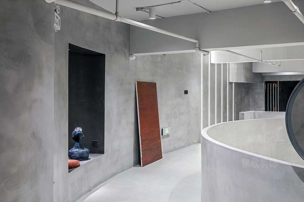 灰色的原始肌理,狂野中帶有克制,加以燈光的輔助與點綴,些許的黑色幽默帶有秩序