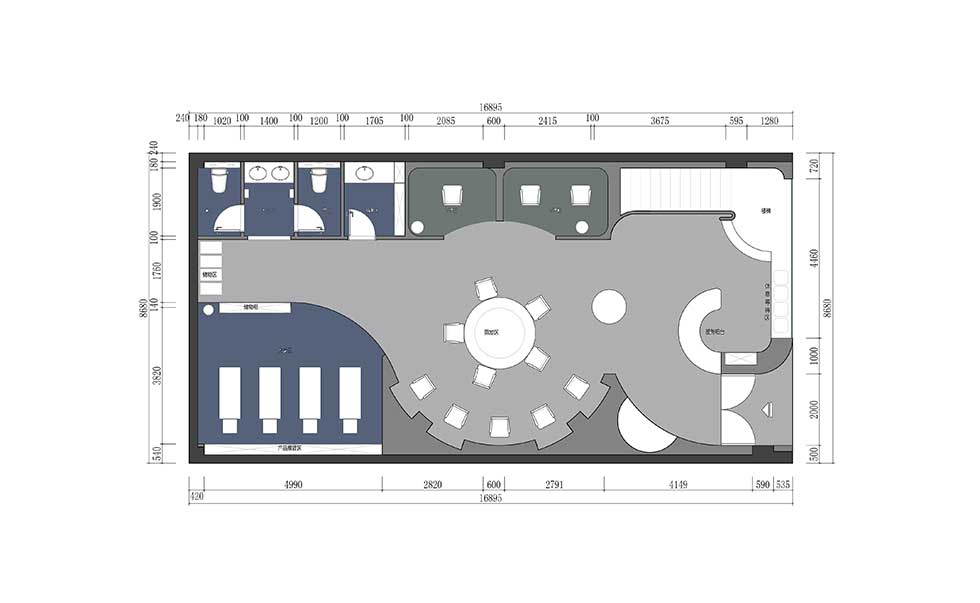 圓柱形的中空結構,環形曲線分布的美發區,通過淺色系冷色調的完美著色,使整體看起來連貫性和統一性很強,又透露著復古和完美主義的理念,工業化社會生活的精致和美感。