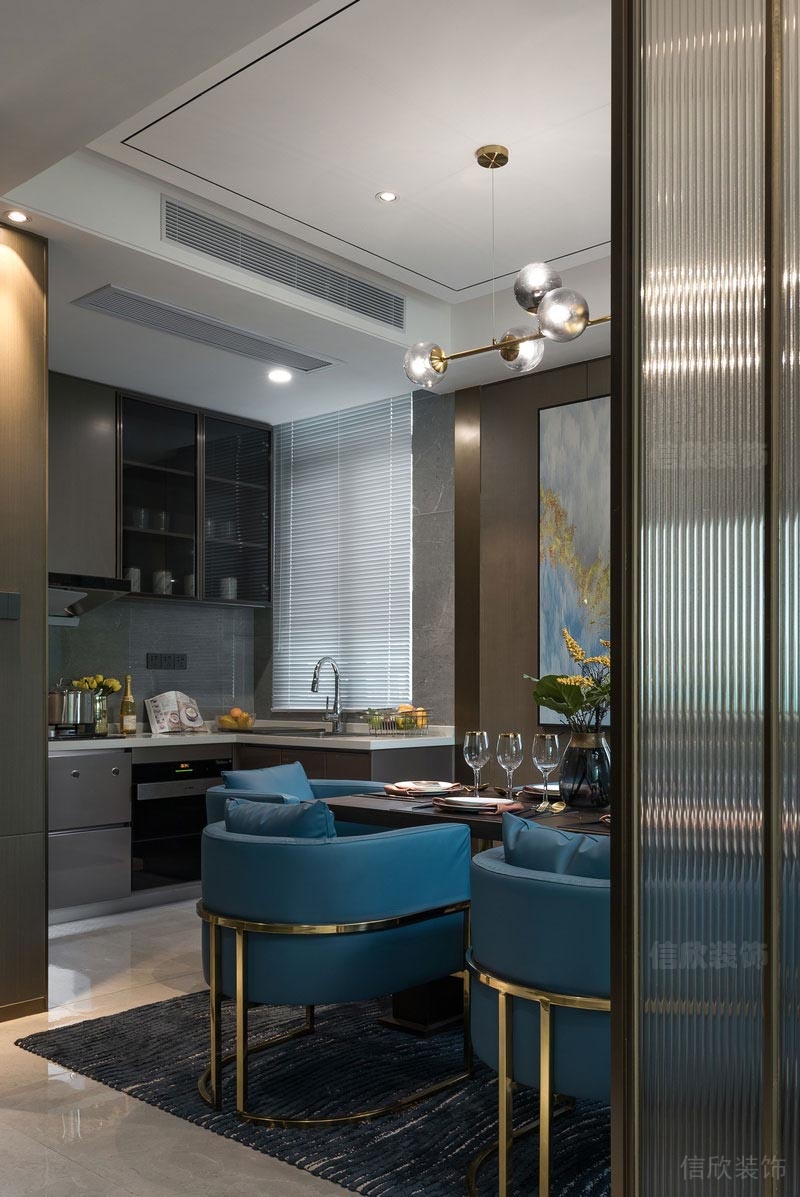 開放式廚房的設計,符合現代開闊大氣的理念,同時空間顯得寬敞而不局限,深色的餐桌,線條優美的藍色餐椅,讓整個餐廳立馬變的活潑起來,并且帶有歐式貴族范的優雅品質。