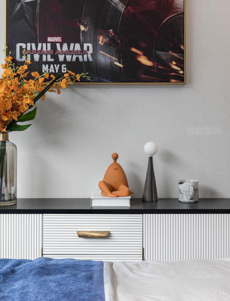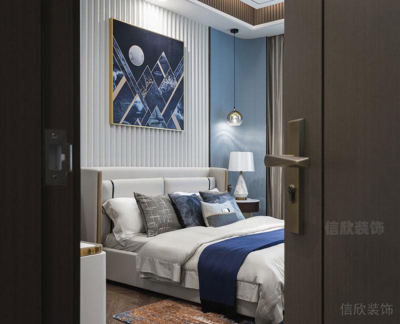 線條簡潔的白色,如天空般閃耀的淺藍,在抽象畫的潮流元素,古典的布藝床,優雅的床頭柜的搭配下,讓整間臥室看起來,色彩秀美,五彩繽紛;舉手投足之間,無比閃現出對品質生活的無限向往。