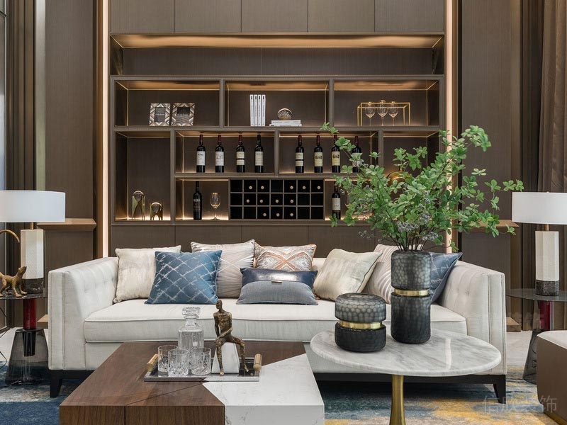 酒柜代替電視背景墻,沙發不靠墻的設計方式,增加了空間感和實用性,深咖實木的深沉,金屬線條的時尚,讓整個客廳的格調立馬得到提升,用優美的裝飾,裝點出奢華的效果。