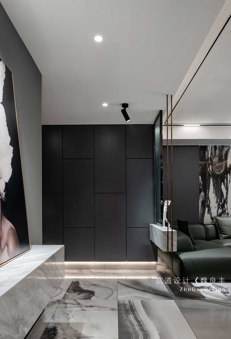 黑色的木飾面護墻板和天然大理石,兩種材質(zhì)之間碰撞,把冷色調(diào)的孤傲和冷酷完美的融合在一起,一眼看上去有一種后現(xiàn)代風格抽象畫的文青氣息和特立獨行的氣質(zhì)。