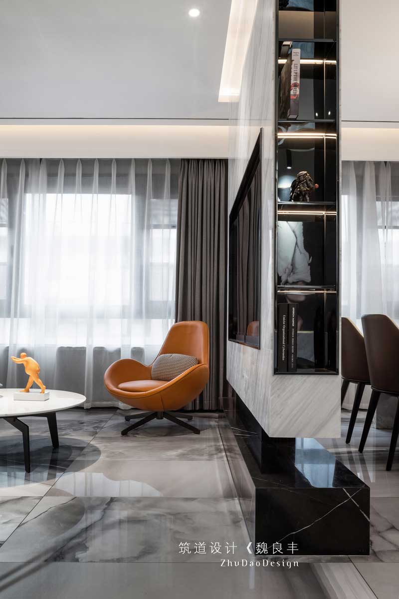 電視背景墻的設(shè)計,放置在中間的方式,把客餐廳分開,讓每個空間獨立性更強,功能性更明細,黑色兩色的天然大理石背景墻,詮釋了黑白兩色永恒的經(jīng)典搭配。