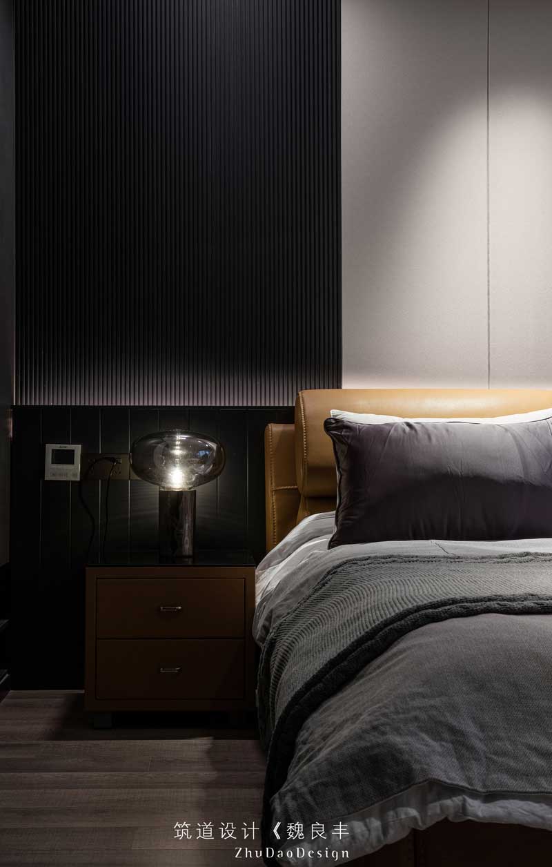 黑色的臥室,隱藏式衣柜的設(shè)計,通過半墻式的背景墻和黑白色調(diào)的護墻板,在光影的設(shè)計下,讓臥室看上去提升了現(xiàn)代主義的潮流感和時尚摩登的格調(diào)。
