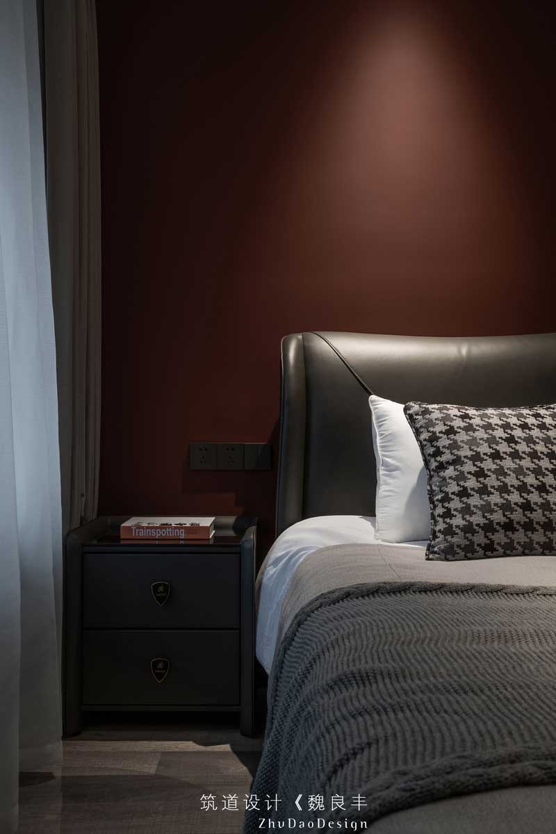 整體的周邊頂,無主燈式樣的設(shè)計,一定程度上起到了降低層高,使整體更充實,更飽滿的效果,深紅色的墻面,讓黑色兩色為主的臥室,增添了一些復古的色調(diào)感。