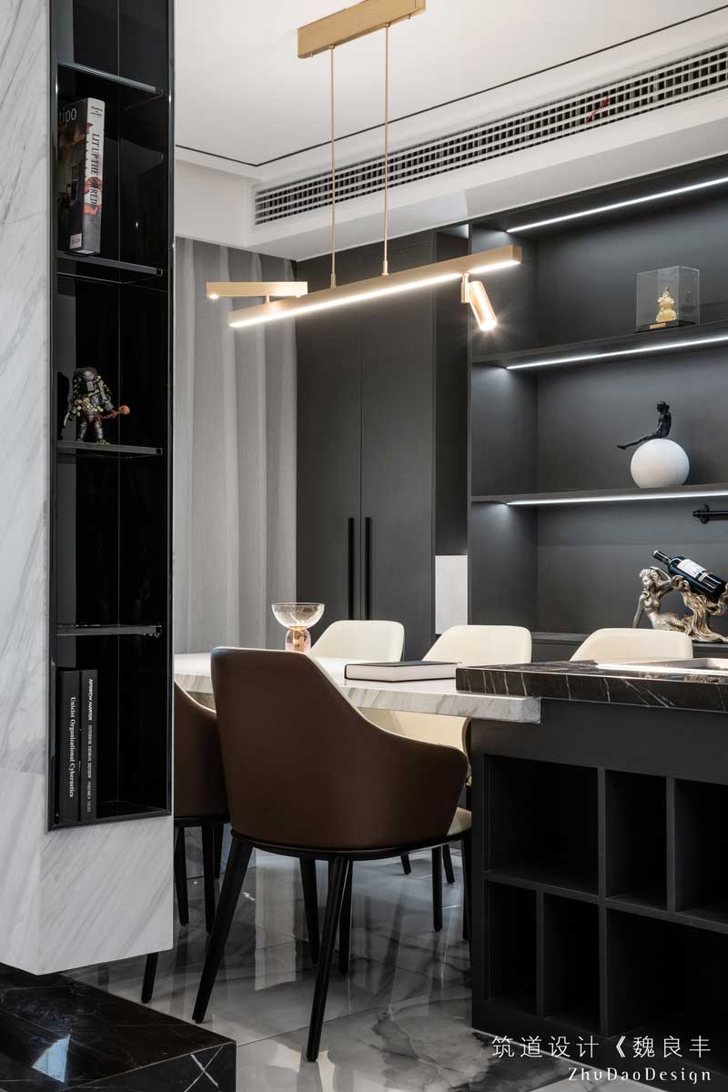 回形吊頂強調(diào)了餐廳的功能性,帶中島柜的設(shè)計,白色和黑色天然大理石的對比,呼應了設(shè)計的主題,簡單直接強調(diào)功能性,西式的餐臺增加了生活的調(diào)味劑。
