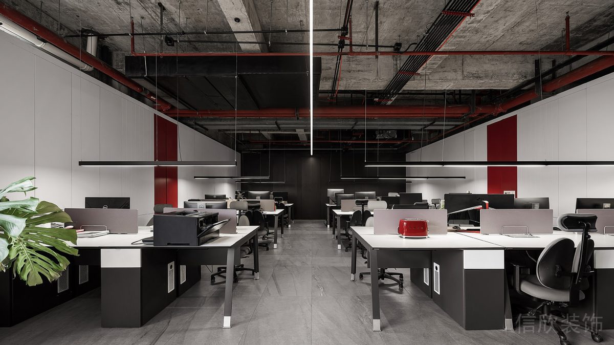 這是一個由我司團隊獨立完成施工的辦公室裝修設計工程,項目坐落于深圳市南山區(qū)崇文花園4號金騏智谷。辦公室整體的裝修面積合共2300平方米,內部空間的裝修配色以大面積覆蓋的黑白灰色調結合多彩的色系元素創(chuàng)立出嶄新的工作場域理念。辦公室基本的空間格調以混搭時尚工業(yè)風的裝修設計手法進行呈現(xiàn),所有的工位統(tǒng)一通過開放式的空間規(guī)劃實行布置,賦予了員工極為寬敞的環(huán)境優(yōu)勢,另外也放大了辦公場域的視野透視感。