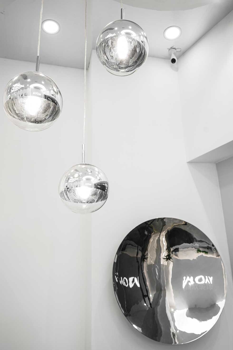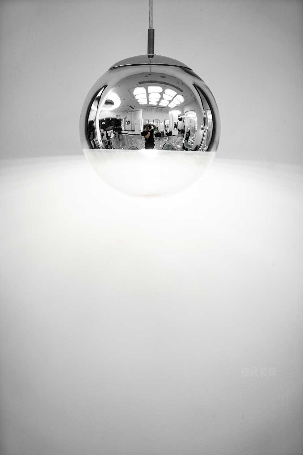 鏡面效果讓空間變化多樣,更靈動不沉重。結合甲方整體預算的把控,本案整體采用鏡面金屬球形吊燈來點綴空間。