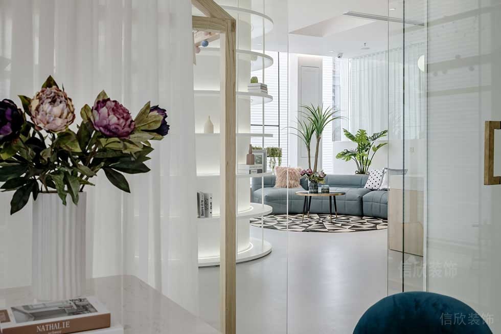 大廳的設計,采用現代主義極簡風的理念,純白色為主體,輕裝修重裝飾的軟裝搭配方式,圓形的柱子作為書架,沿窗邊設置沙發和休閑椅的休息區,打造出美觀實用的高端感覺。