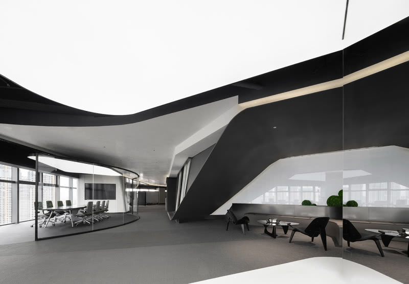 二十世紀藝術大師瓦西里·康定斯基在闡述點線面的抽象理論時,曾提出從外在概念與內在張力兩個層面的解構方式,因而每一根獨立的線條或形狀都可以理解為一種元素,設計師在運用線條語素時,亦是將藝術張力融入空間之中。“往返于家和公司的人們,是城市間流動的力量,塑造城市的同時,成就自我。我們的設計以此為題,以流動的線型語言,展呈商辦空間的未來性。”