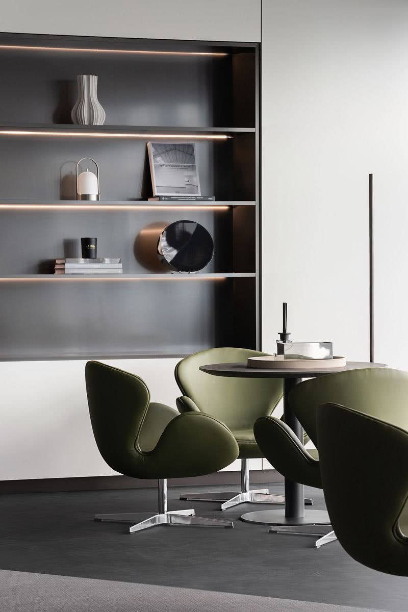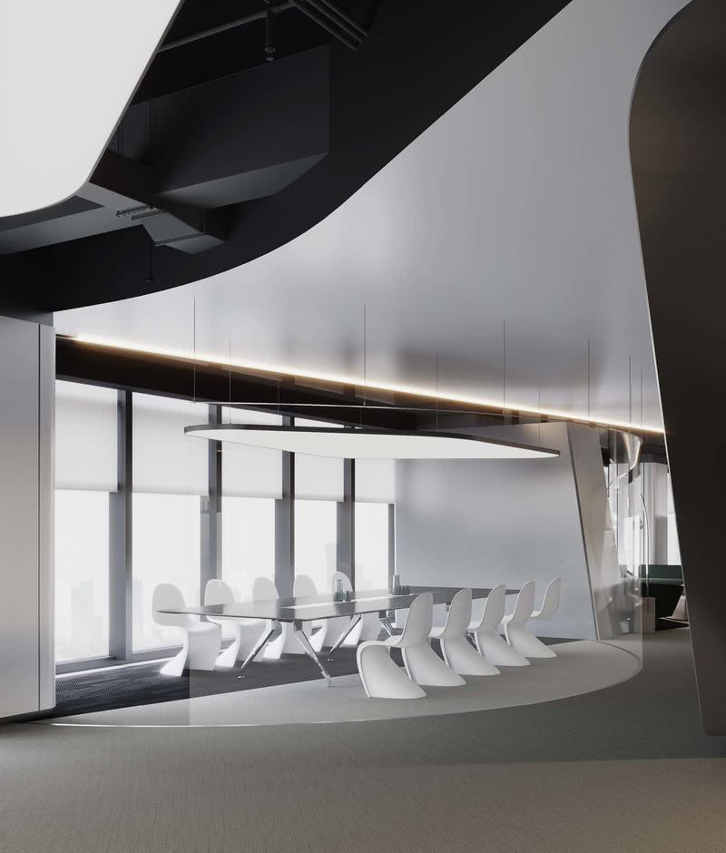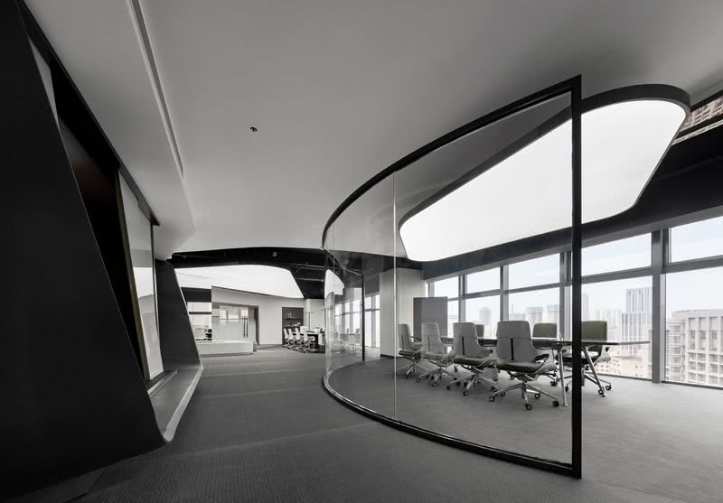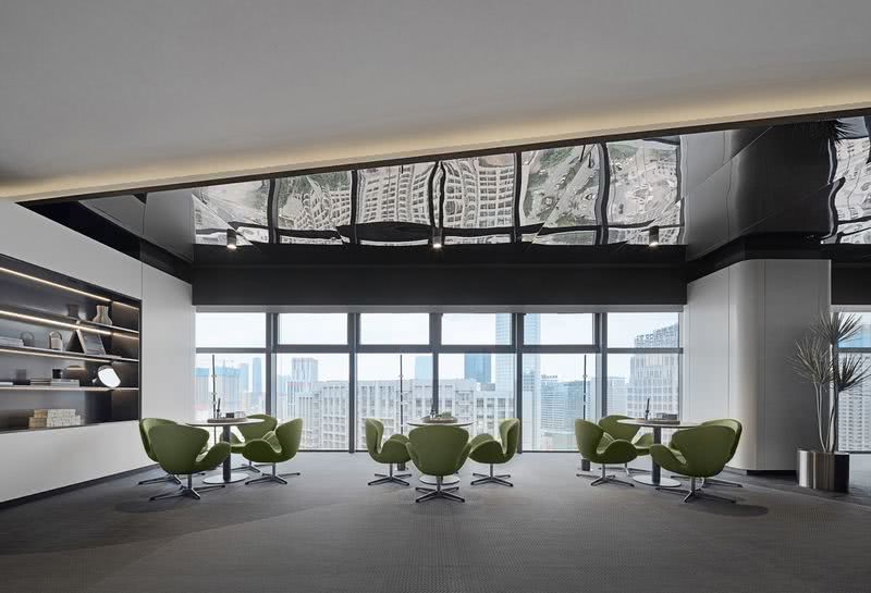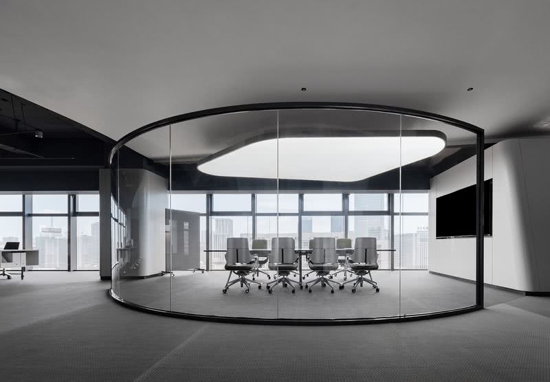 會議室延續了柔和的流線語言,設計師以全明玻璃作為區隔內外空間的介質,而在視覺觀感上無界內外,隱喻內外一致的協作關系,以及恰到好處的距離感。銀灰與淺綠勾勒出空間的商務質感,大面積幾何頂燈的亮度呼應著暗色塊面,形成明暗層次對比以及極具當代感的藝術畫面。 冥想花園