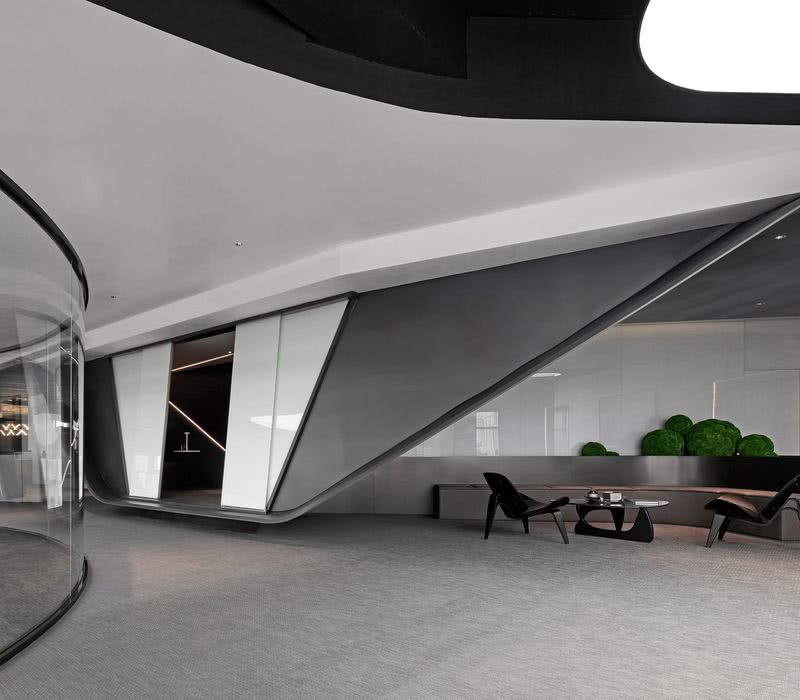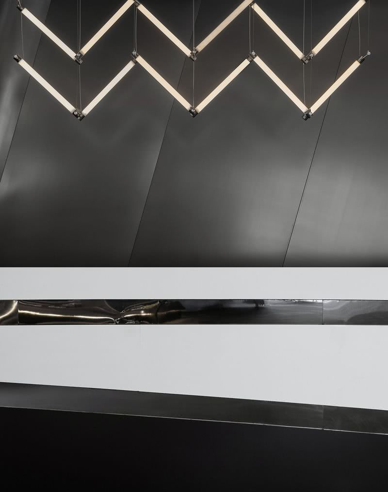 當筆直的線條,延伸至圓潤的弧度轉角,空間結構上便形成了弧面的幾何視覺。設計師通過對線條的藝術化演繹,與嚴謹、干練的商務氣質相結合,不僅延展出極簡的藝術細節,亦描摹出空間予人的第一印象 —— 自由而有序,通透而大方。12根線型燈飾排成陣列,在不同視角下,交織出不同形狀的幾何光影,與創意拼合的接待臺構就豐富的層次感。