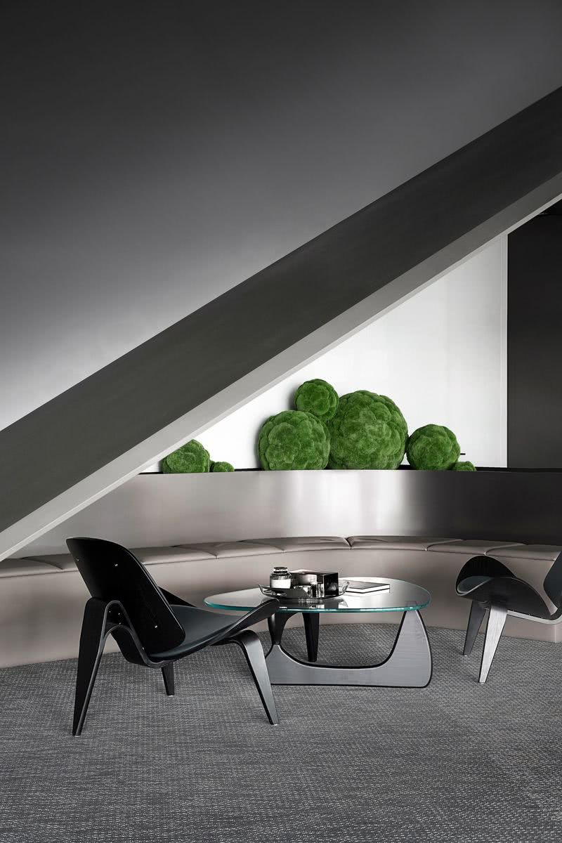 設計師對于體塊結構的妙用,構造出一個“半隱”狀態下的冥想花園,強化人與空間的互動關聯,與線條同樣簡潔利落的家具、修剪為圓球形的仿真苔蘚端景一起,將舒緩、寧靜的氛圍渲染到極致。 VR HUB