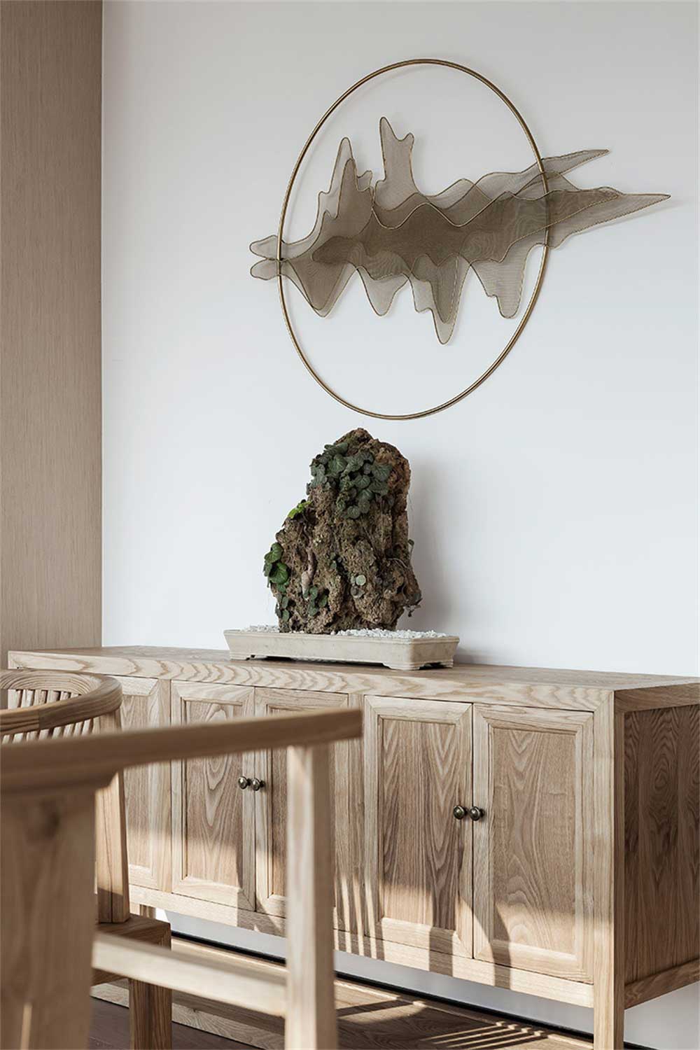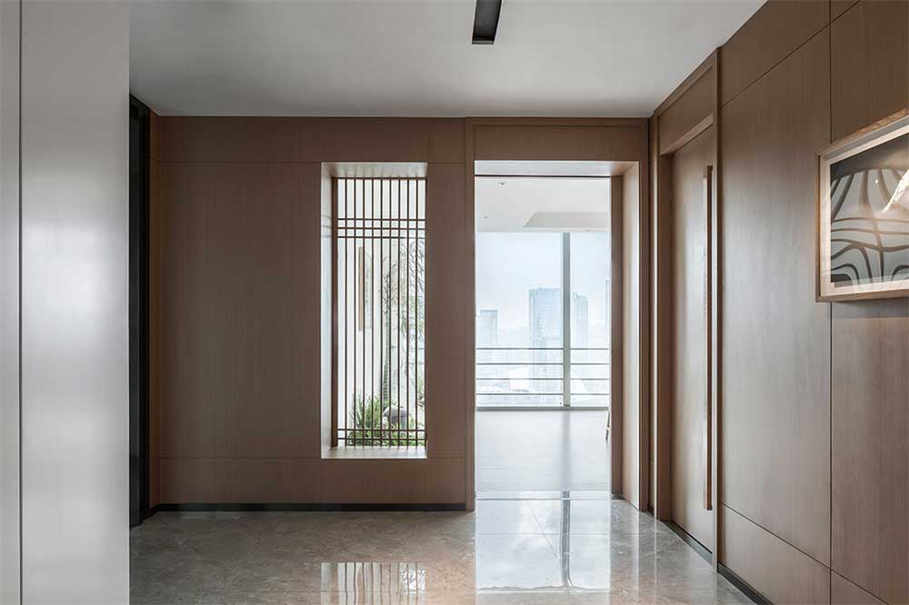 前廳空間以灰色大理石地面,白色大理石背景墻,淺色木紋的護墻板,平頂和周邊頂相結合,木材與石材結合的前臺等元素,構建出一個簡單大氣,又儒雅內斂的新中式主義前廳設計,兼具了美感與實用性。入戶的過道,采用木紋護墻板和門一體式的設計看起來風格更統一,室內的枯山水景觀,鏤空式的墻體的玄關柜則體現中式古典文化的內涵。會議室和吧臺區,以護墻板穿插中式山水畫的巧妙點綴,讓空間更飽滿,更有古風的氣息。辦公室以長條形的實木和平頂的結合,使延伸感更強。洽談區選擇在落地式窗戶的前臺,擺放上實木的家具和泡茶桌,采光和采景效果最好,一邊喝茶一邊欣賞美景,符合了唐詩中“會當凌絕頂,一覽眾山小”的豪邁氣勢。