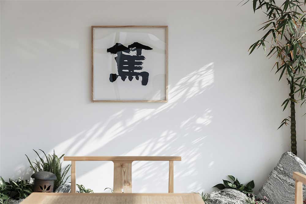 綠植和木飾面板結合的背景墻,中式的沙發家具,養眼的綠意,增添了自然的氣息。