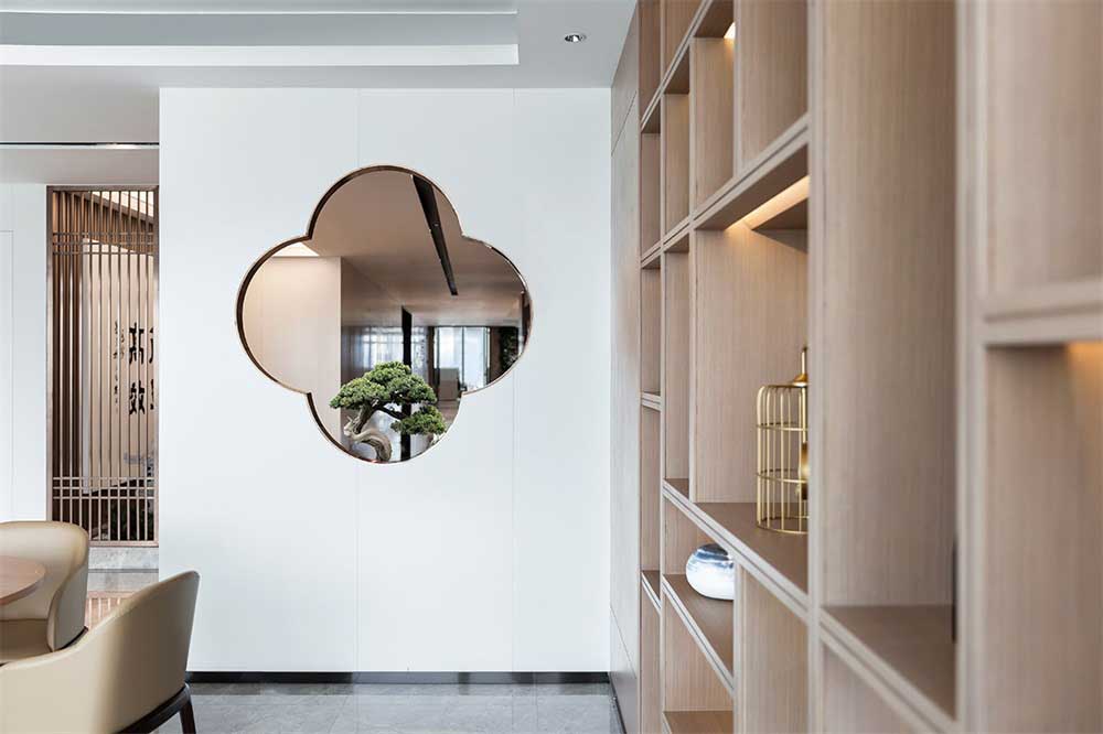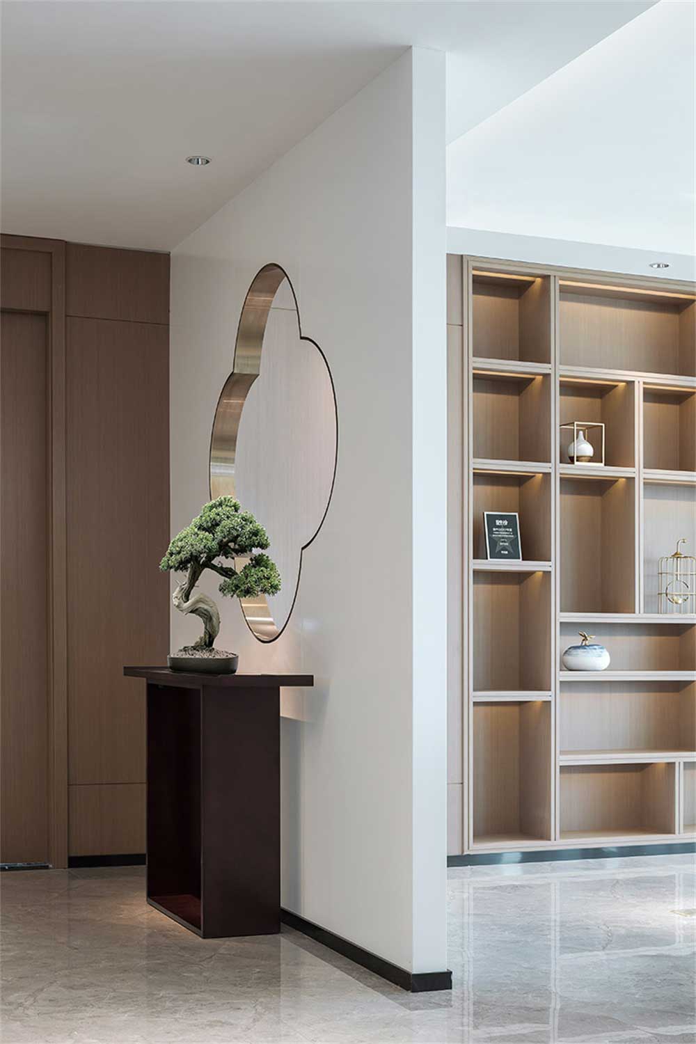深圳市寶安1000平國中創投辦公室裝修會議室,中式月門的設計,兩邊做天然大理石瓷器展臺,更有古典文化底蘊。
