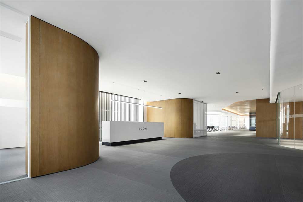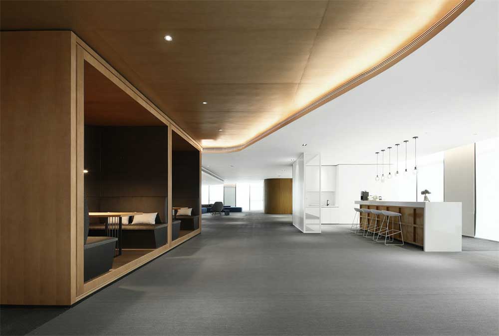 現代風格辦公室過道,開闊的過道弱化了各區的功能性,木飾面和白色石膏板的吊頂,不規則的造型更顯時尚。