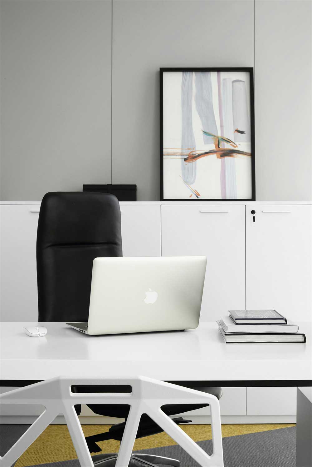 現代風格辦公室前臺,白色的臺面,黑色的底座,永恒不變的經典搭配。