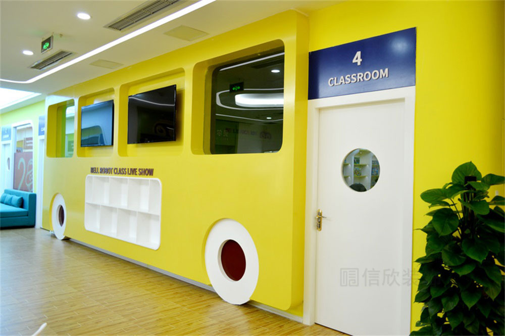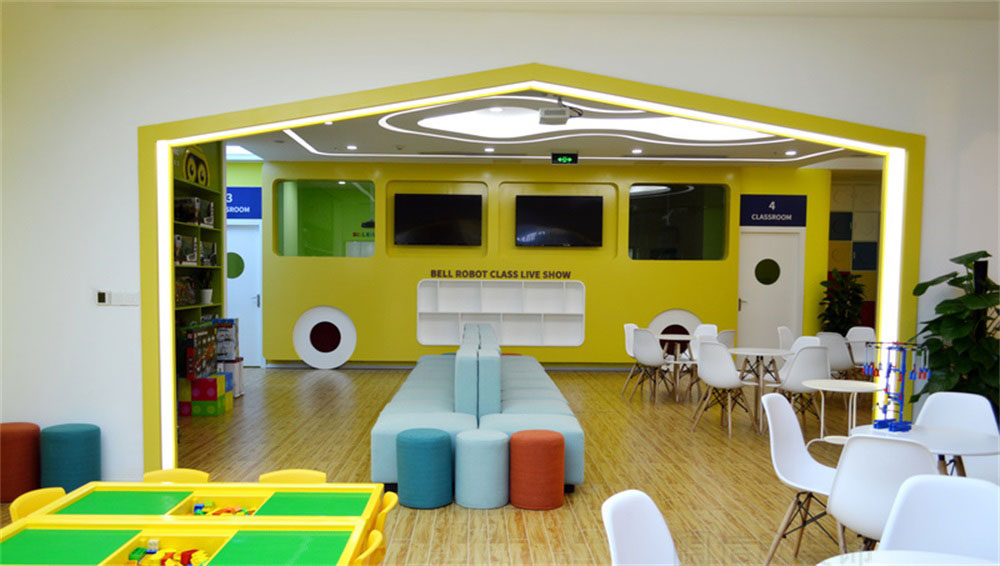 本案位于深圳市寶安區松崗貝爾機器人兒童學院培訓機構,是一所現代科技風的兒童學院裝修設計案例,針對兒童的教育培訓的裝修,在裝修時應多選擇簡潔大氣的簡約裝修風格,避開夸張視覺的另類風格,營造一個輕松明快的良好學習玩耍環境。風格、色彩、照明、裝飾等都要進行合理的裝修設計。