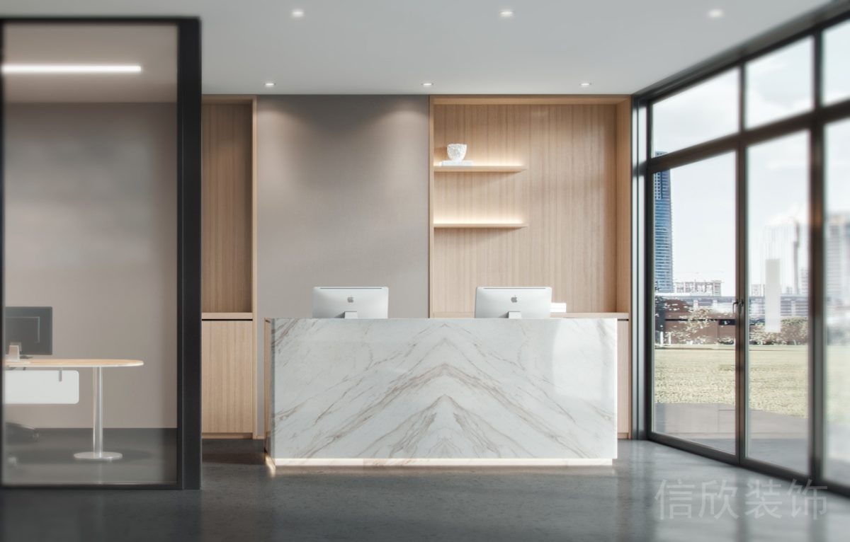 機構內部采用馬賽克加厚地毯,綠色亞克力形象版和前臺接待桌,設計簡潔現代,展現專業和活力。