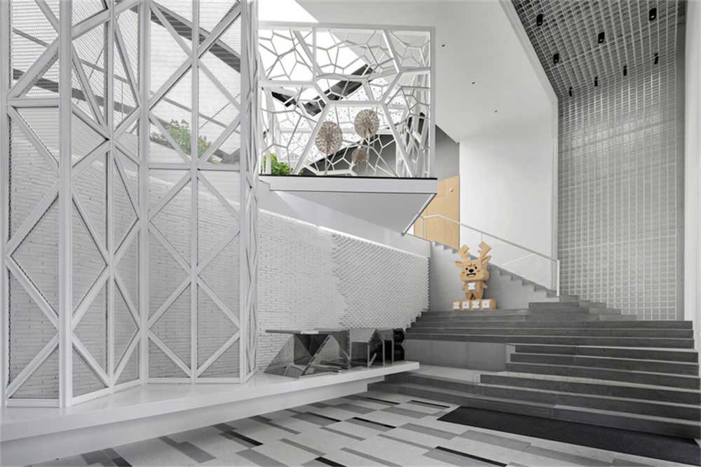 入口為網狀金屬結構,并利用高度優勢,營造出令人震撼的視覺效果。網狀的連接象征著蒲公英的傳播與秩序。金屬logo和木質的吉祥物,作為有趣和跳躍的代表,點綴其間。
