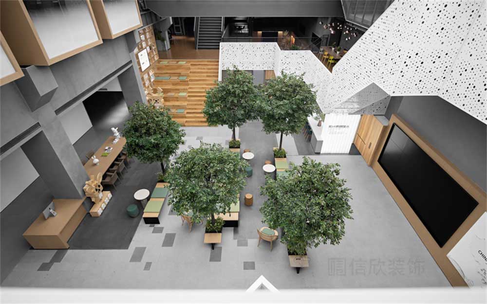 會客區域,整體打造出“陽光公園”的概念。綠色植物和長條的木制座椅,和草木綠的軟墊做出亂中有序的構成感覺,給人有置身公園、享受戶外的空間感。