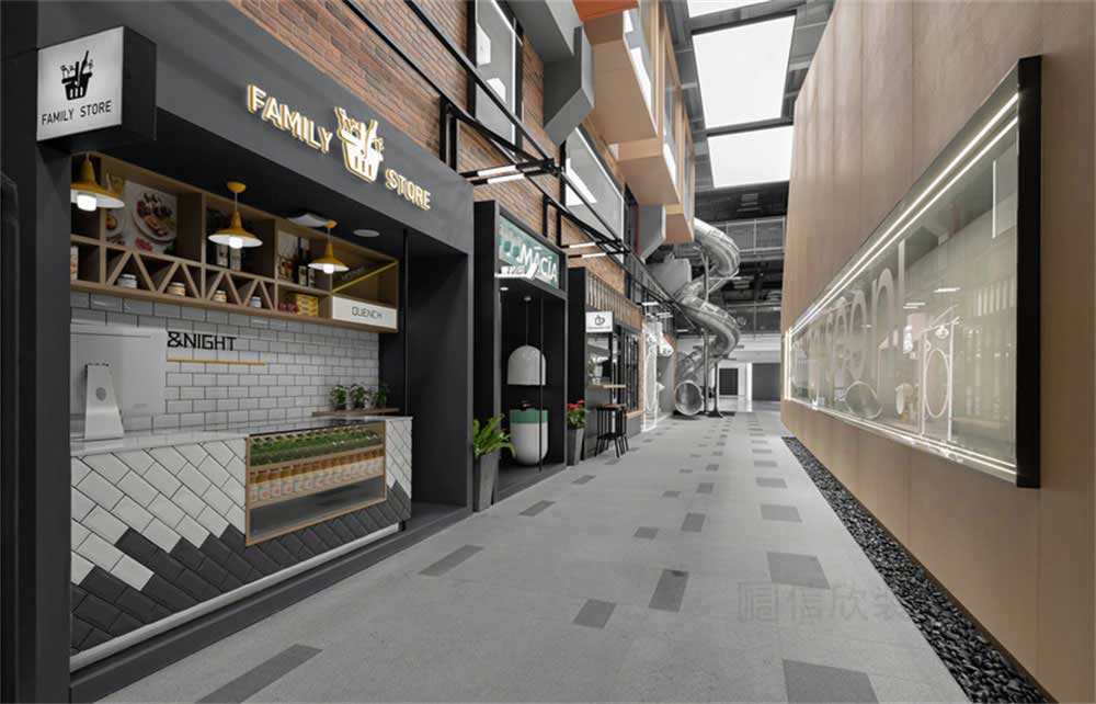 整個公區走廊做成室外街景,櫥窗的點綴,使人身臨其境。