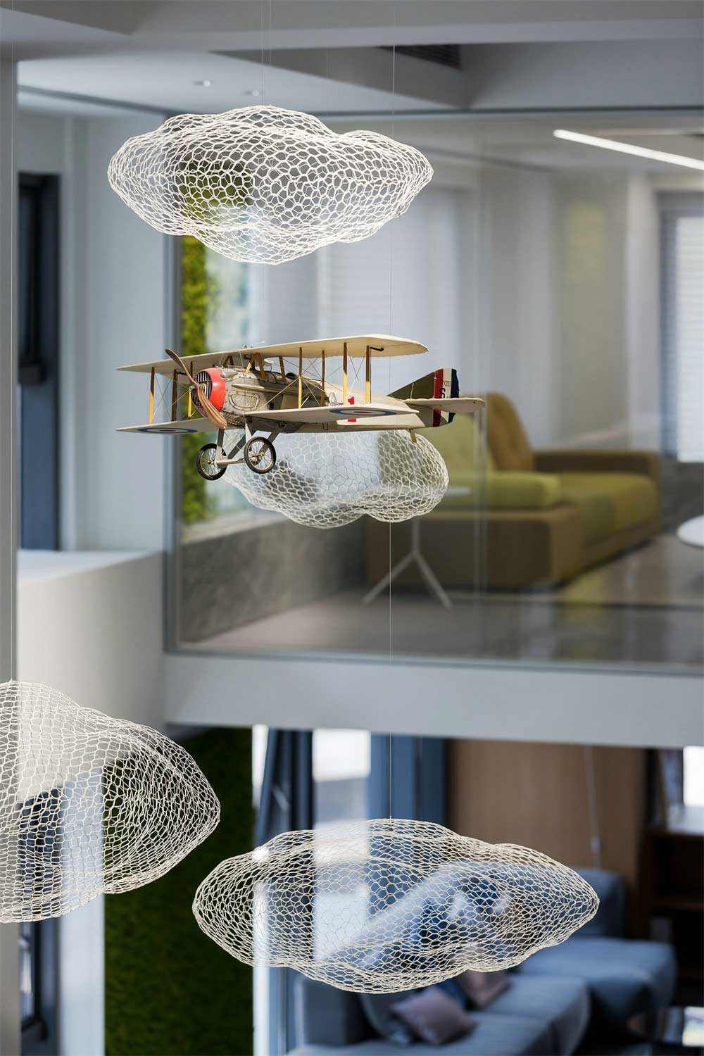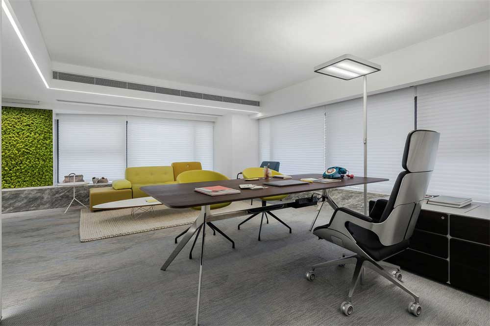 長條形的鋼結構和實木飾面板的辦公區,黃色布藝的沙發和橢圓形茶幾的會客區,簡單的功能性區域劃分,讓整體看上去開闊大方空間感極強。
