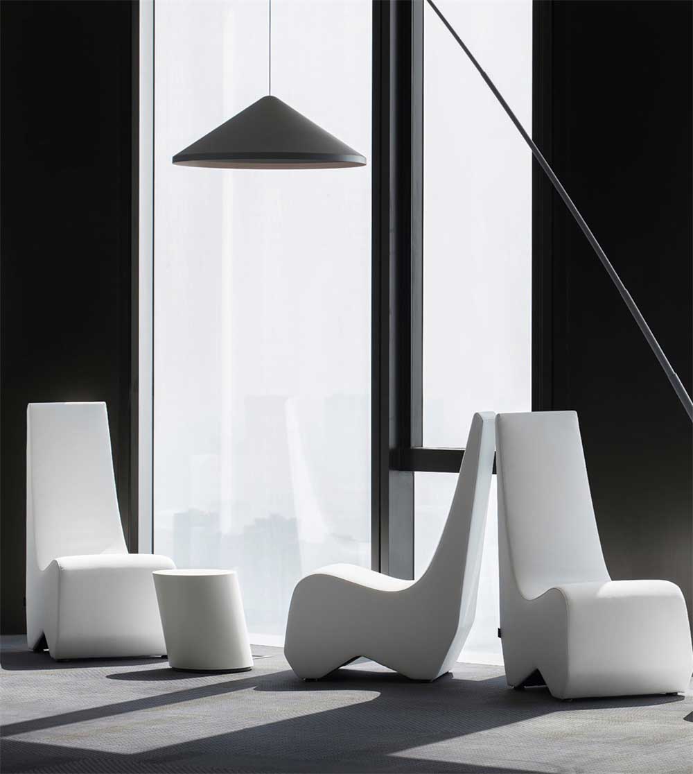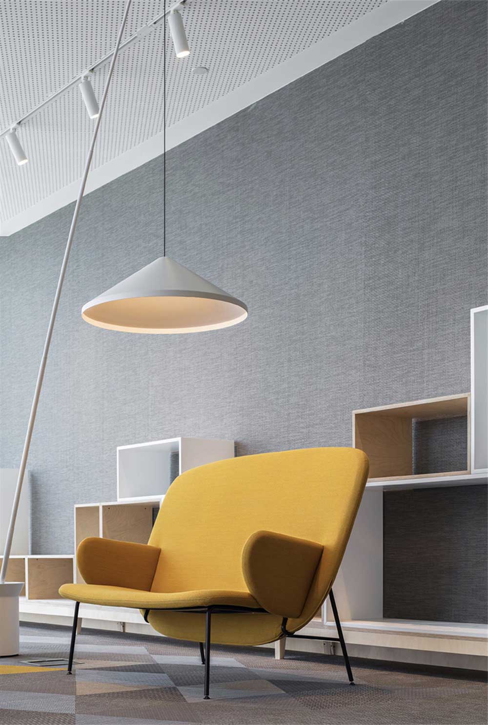 邁科集團現(xiàn)代風格辦公室洽談區(qū),純白色的洽談區(qū),白色的木質(zhì)沙發(fā),原木風的桌子,北歐風的藝術吊燈。