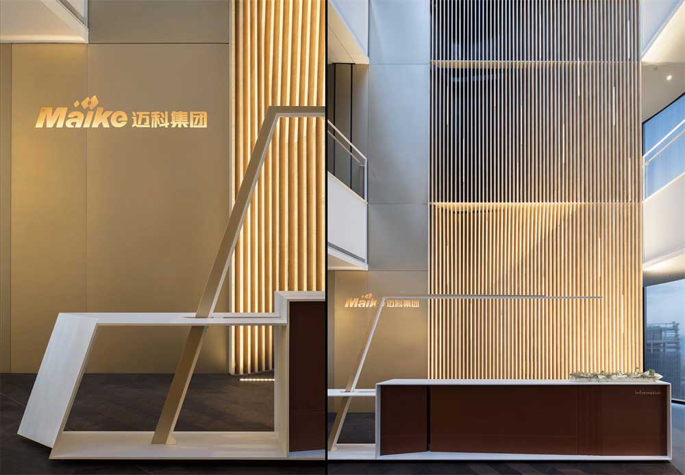邁科集團現(xiàn)代風格辦公室前臺,實木格柵背景墻,造型獨特的藝術效果前臺,前衛(wèi)而獨特。