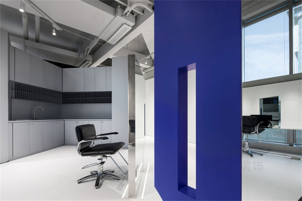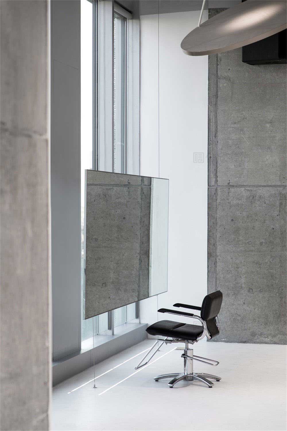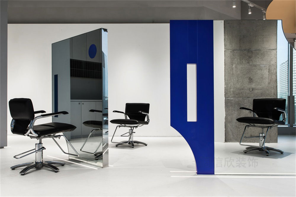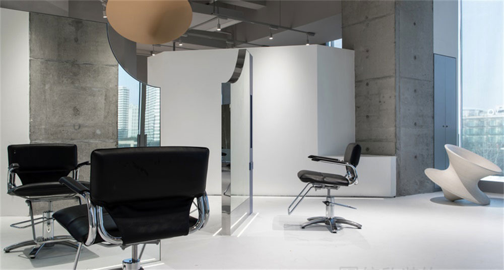 剪發區在白色地面,灰色頂面的應用看上去素雅簡約,雙面式立體圖形的全身鏡,猶如一個個美麗的藝術品,填補了整個場景的空缺,有點睛之筆的妙處。