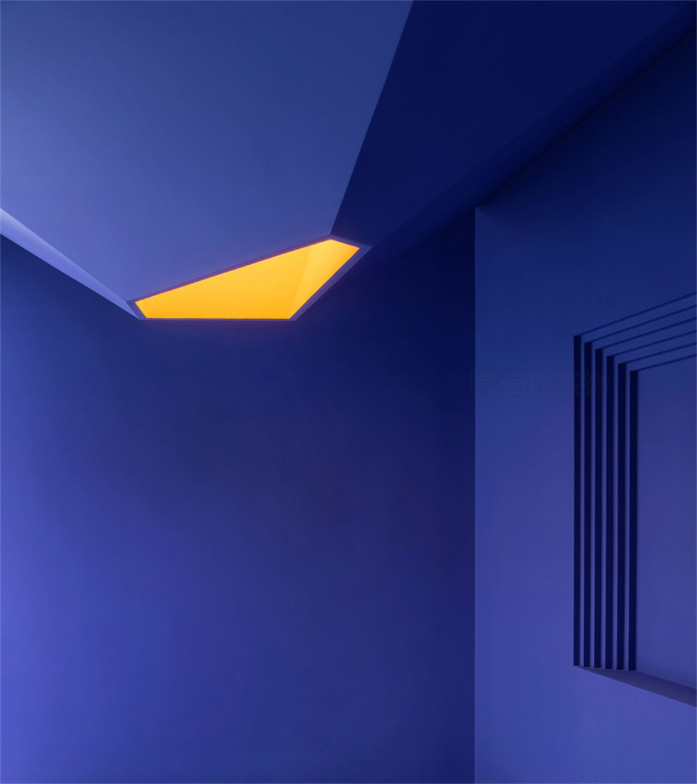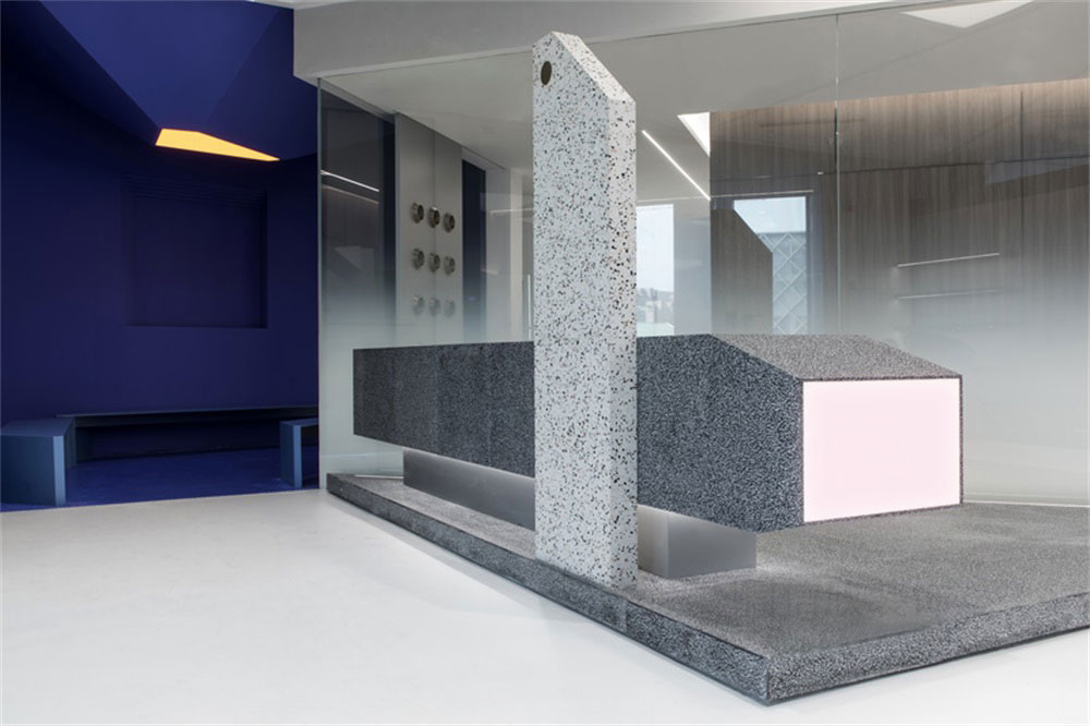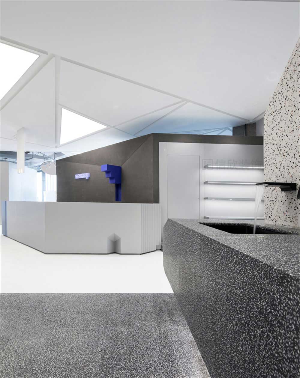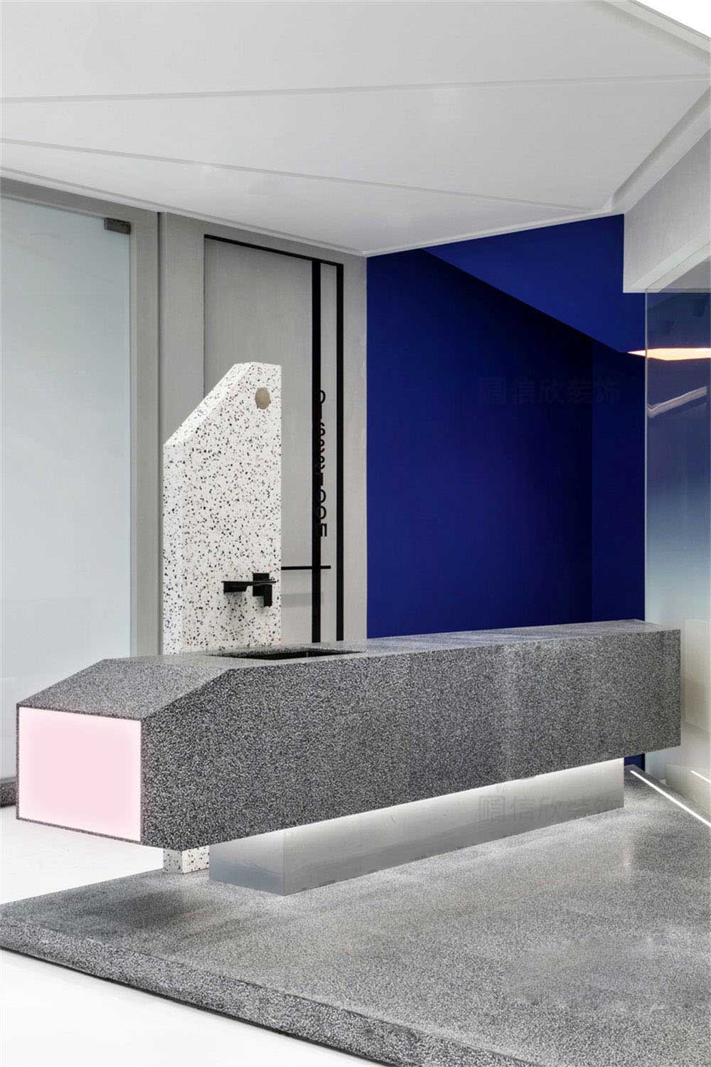 前臺的設計上,采用了立體圖形拼接的方式,設計新奇獨特,創意十足,黑白灰藍四種顏色為基調,把多個立體造型,組合為一個藝術感十足立體圖形。