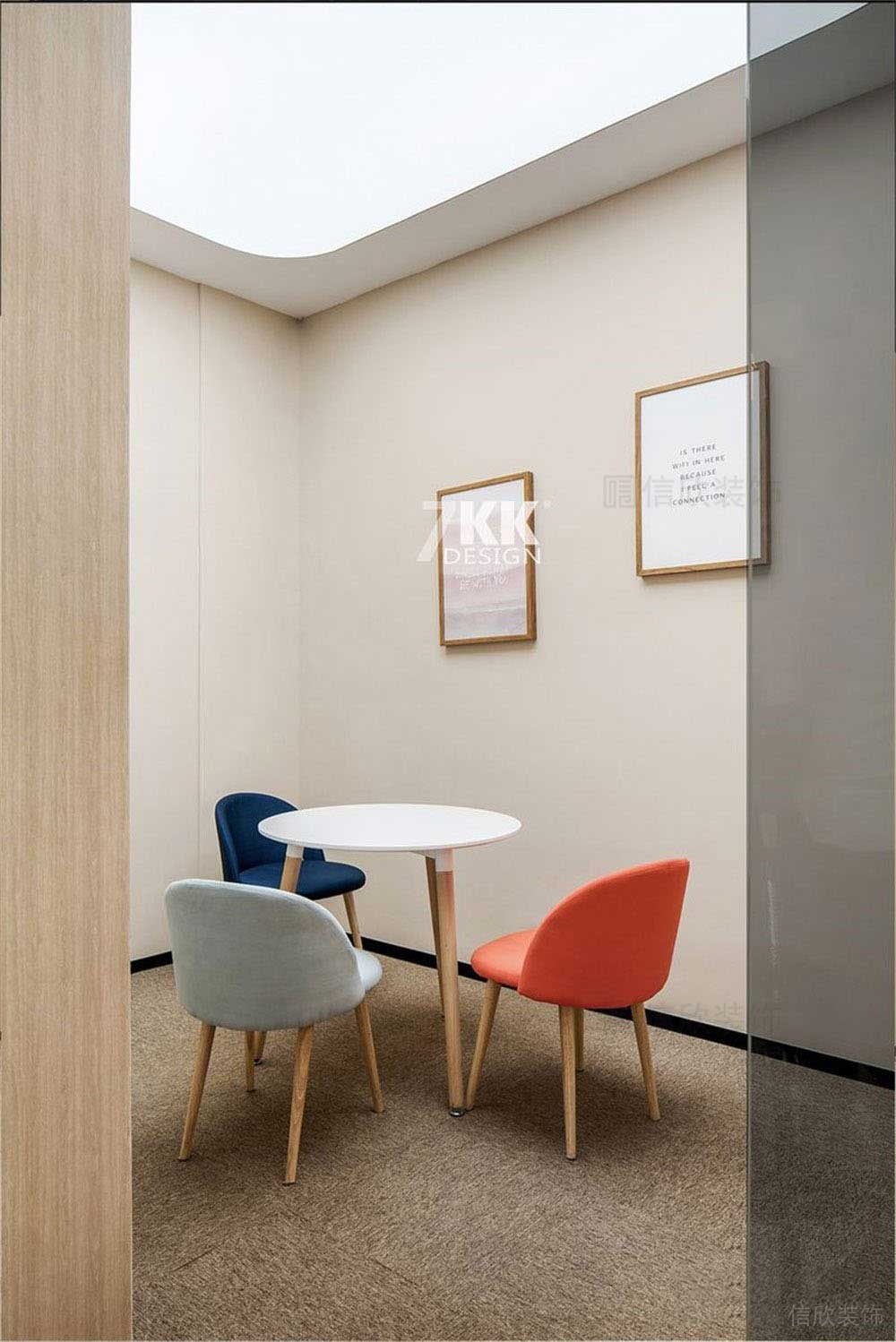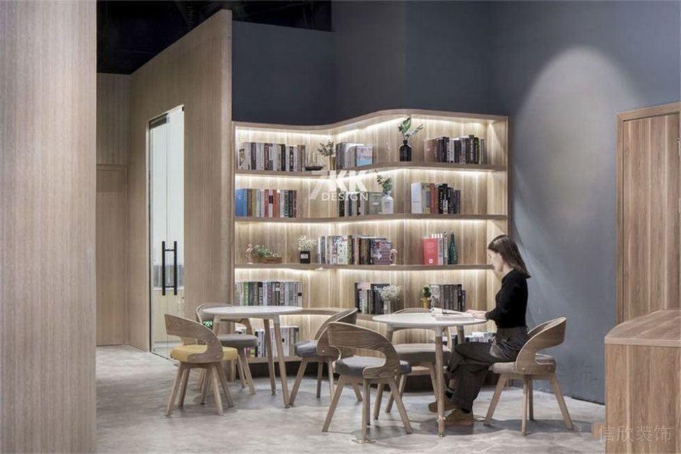 淺色的書柜代替背景墻的設(shè)計(jì),在燈光的裝點(diǎn)下,明亮溫馨,思考和洽談的時(shí)候,更有一種原始自然的輕松感。