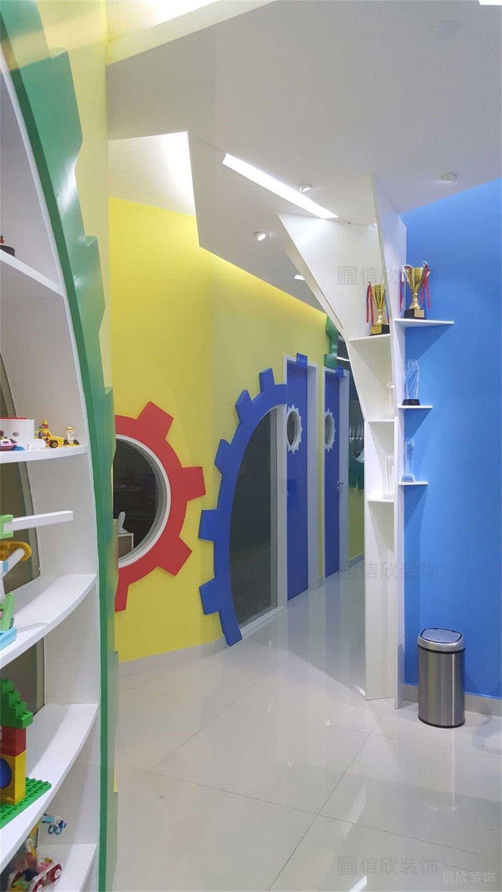 流線型的前臺,線條感十足,充滿想象,嵌入墻面的書柜,里面各式各樣的玩具,滿足了孩子們的好奇心和探索欲。