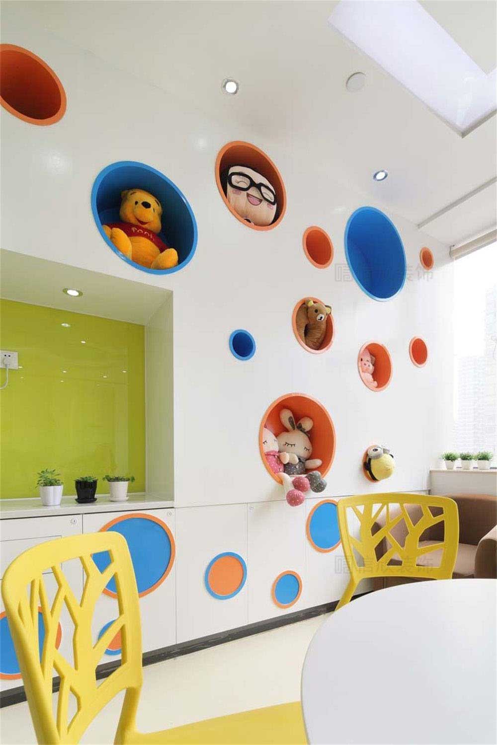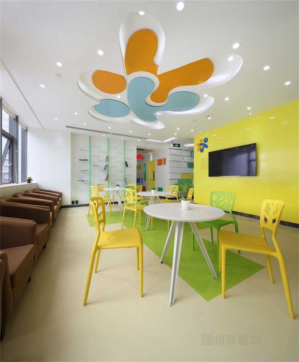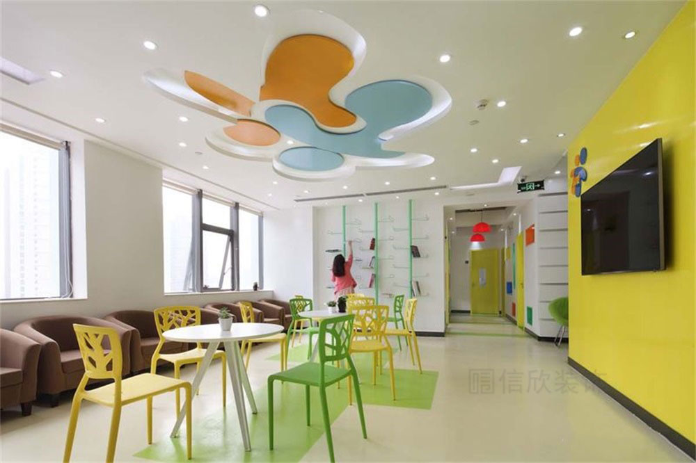 等候區(qū)采用一體式的石膏頂,加上鏤空的造型設(shè)計,如七色花一樣的閃耀,讓孩子對學(xué)校也充滿了向往和喜愛。