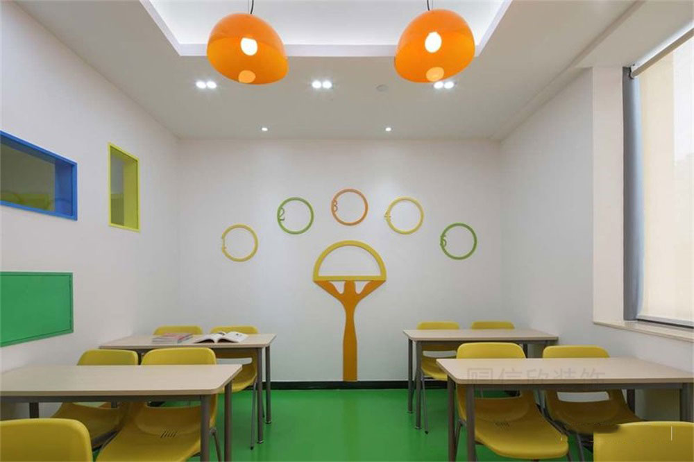 圓形的柱子,加上黃色的石膏板燈膜的設(shè)計,讓本來突兀的柱子,和教室融為一體,成了不可或缺的裝飾,既有設(shè)計特點(diǎn),又不失美觀。