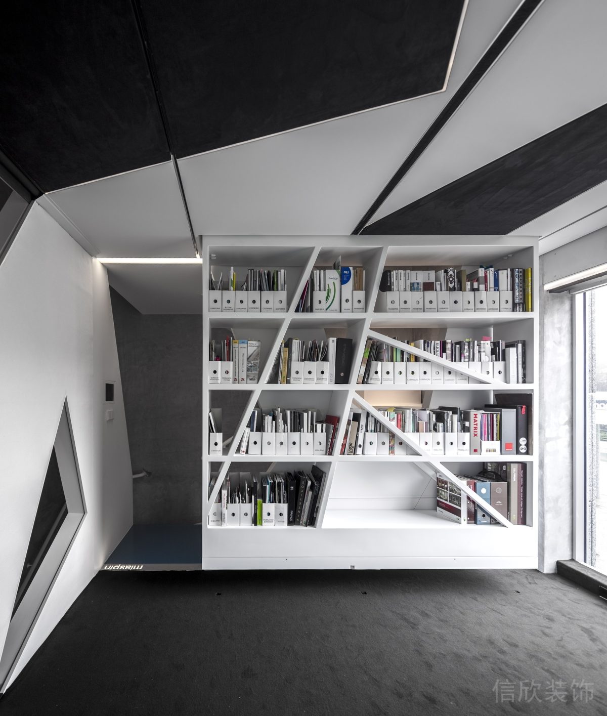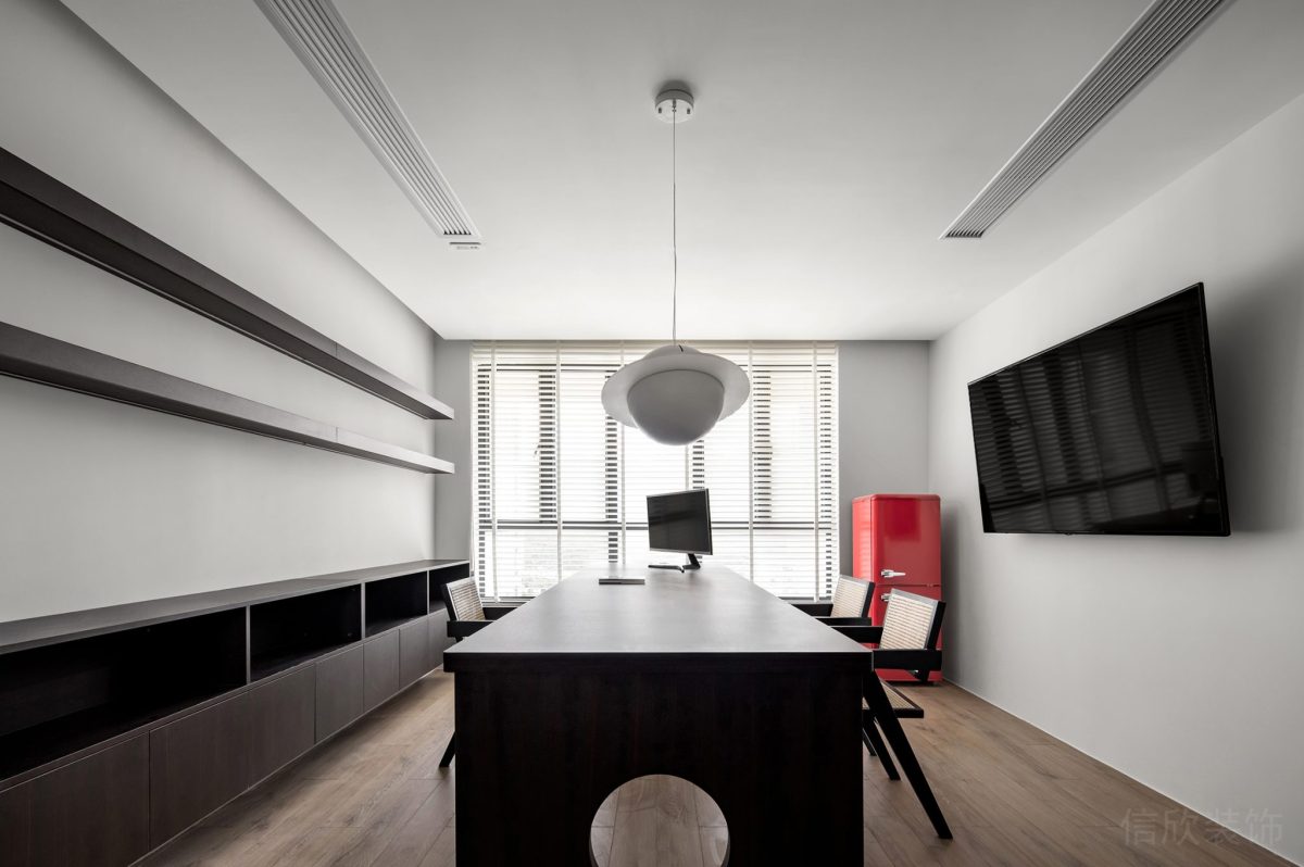 落地格子窗和弧形沙發是公共區域裝飾的兩個關鍵元素,它們可以相互搭配,為空間帶來舒適、現代和獨特的氛圍。暗色空間使用白色家居點綴,巧妙創意的體現辦公室結構的特色區域分類。