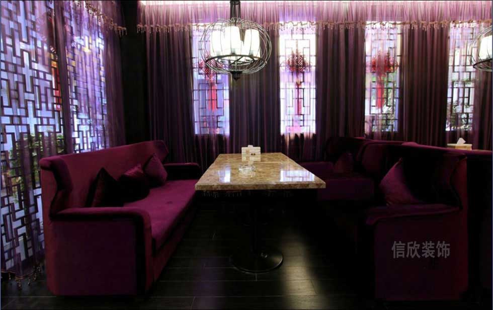 抽象的潑墨畫作為壁紙,紅木地板和鏤空式隔斷代替的門窗,古典式的雕欄畫棟,雅致小樓休息區(qū),紫色的家具和窗簾渲染下,更顯得幽靜和靜謐,有非常安靜的隱私性。
